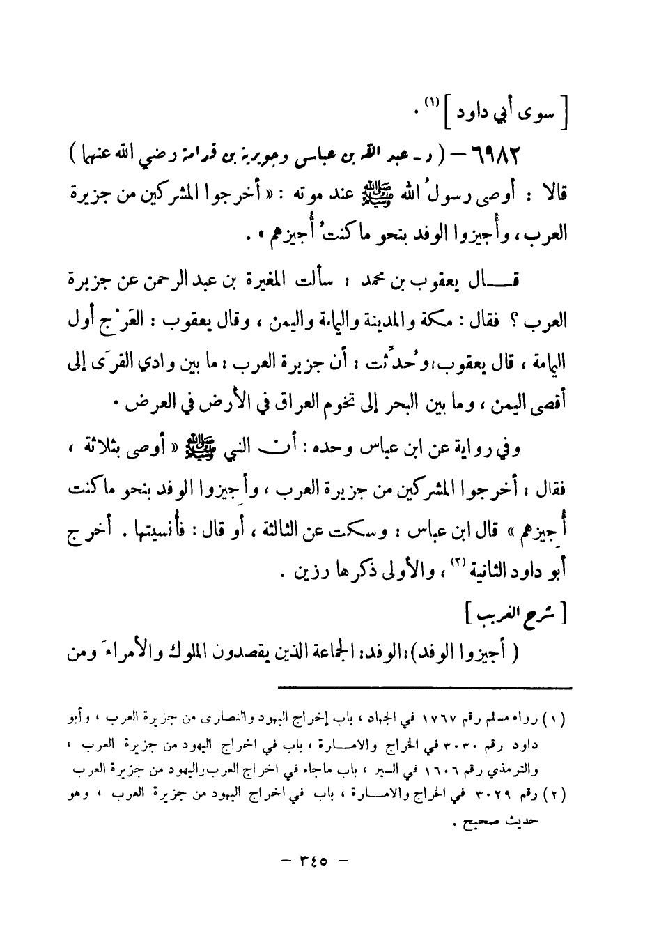 6982 - (د) عبد الله بن عباس وجويرية بن قدامة - رضي الله عنهما - قالا: أوصى رسولُ الله - صلى الله عليه وسلم- عند موته: «أخرجوا المشركين من جزيرة العرب، وأجيزوا الوفد بنحو ما كنتُ أجيزهم» .