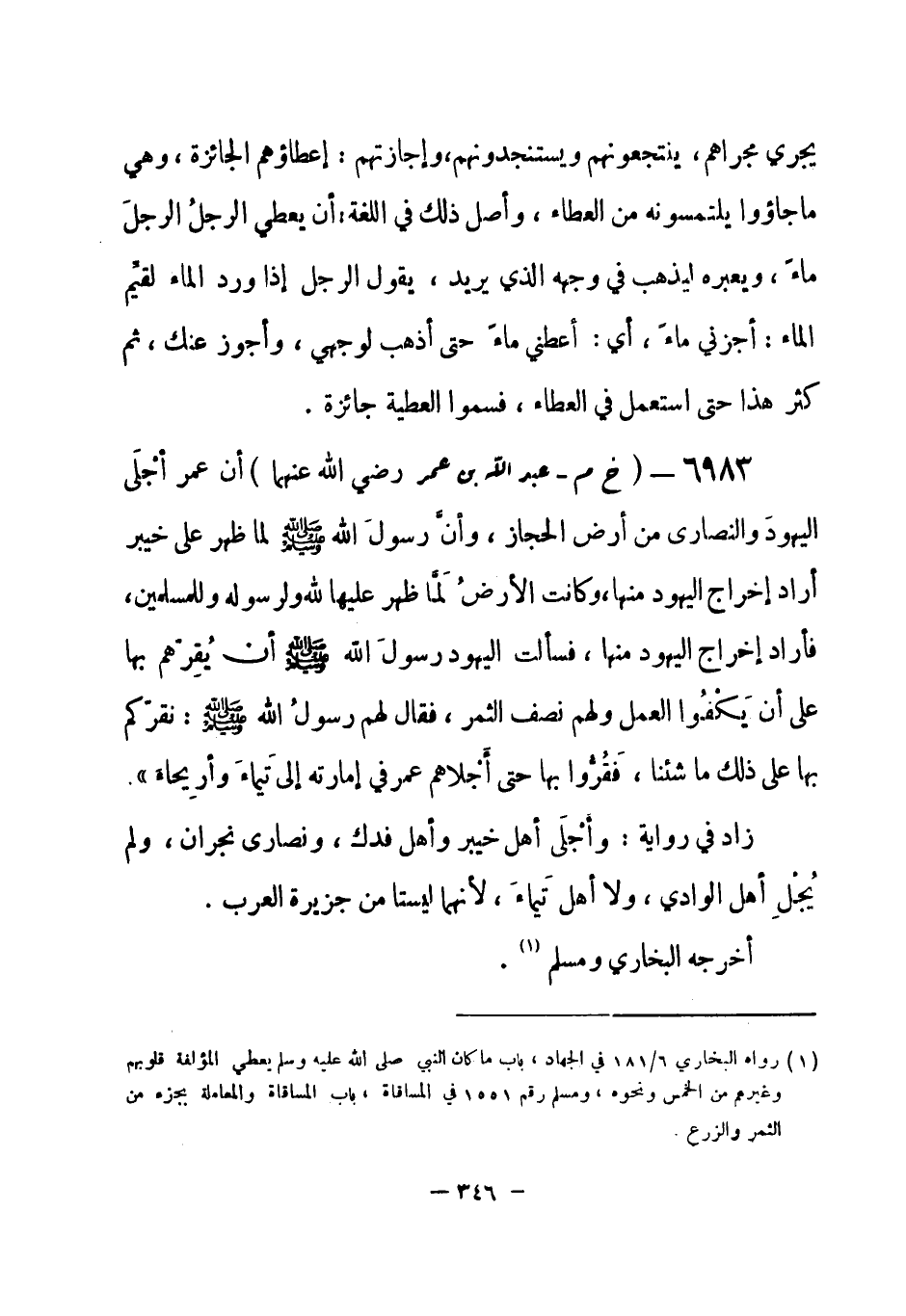 6983 - (خ م) عبد الله بن عمر - رضي الله عنهما -: «أن عمر أجْلَى اليهودَ والنصارى من أرض الحجاز، وأنَّ رسولَ الله - صلى الله عليه وسلم- لما ظهر على خيبر أراد إخراج اليهود منها، وكانت الأرضُ لَمَّا ظهر عليها لله ولرسوله وللمسلمين، فأراد إخراج اليهود منها، فسألت اليهود رسولَ الله - صلى الله عليه وسلم- أن يُقِرّهم بها على أن يَكْفُوا العمل ولهم نصف الثمر، فقال لهم رسولُ الله - صلى الله عليه وسلم-: نقرّكم بها على لك ما شئنا، فَقُرُّوا بها حتى أجلاهم عمر في إمارته إلى تَيماءَ وأرِيحاء» .