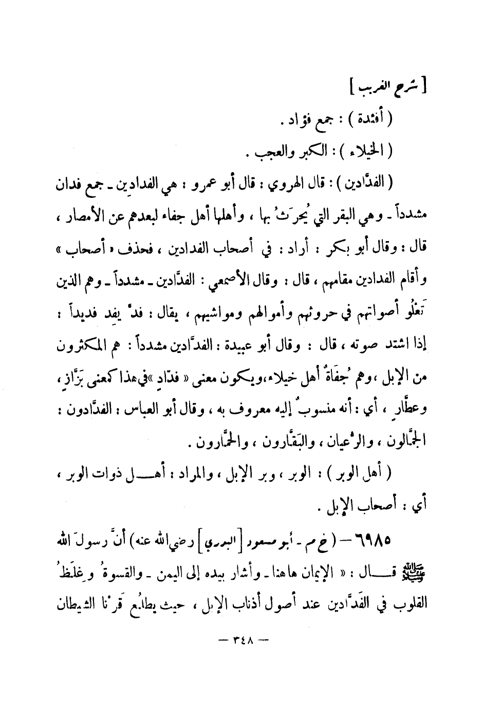 6985 - (خ م) أبو مسعود [البدري]- رضي الله عنه - أن رسولَ الله - صلى الله عليه وسلم- قال: «الإيمانُ هاهنا - وأشار بيده إلى اليمن - والقسوةُ وغِلَظُ القلوب في الفَدَّادين عند أصول أذناب الإبل، حيث يطلُع قَرْنا الشيطان -[349]- في ربيعة ومُضَر» أخرجه البخاري ومسلم (¬1) .