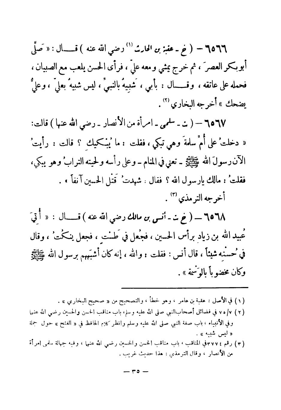 (¬2) 7 / 75 في فضائل أصحاب النبي صلى الله عليه وسلم، باب مناقب الحسن والحسين رضي الله عنهما، وفي الأنبياء، باب صفة النبي صلى الله عليه وسلم، وانظر كلام الحافظ في " الفتح " حول جملة " ليس شبيه ".