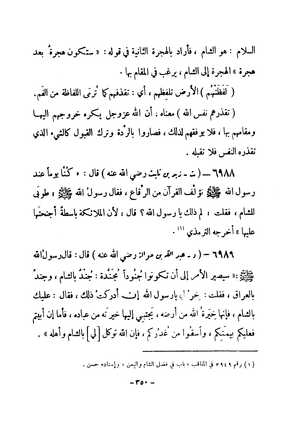 6988 - (ت) زيد بن ثابت - رضي الله عنه - قال: كُنَّا يوماً عند رسول الله - صلى الله عليه وسلم- نؤلِّف القرآن من الرِّقاع، فقال رسولُ الله - صلى الله عليه وسلم-: «طوبَى للشام، فقلت: لم ذلك يا رسول الله؟ قال: لأن الملائكة باسطة أجنحتَها عليها» أخرجه الترمذي (¬1) .