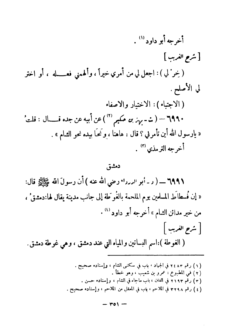 6991 - (د) أبو الدرداء - رضي الله عنه - أن رسولَ الله - صلى الله عليه وسلم- قال: «إن فُسطَاط المسلمين يوم الملحمة بالغُوطَةِ إلى جانب مدينة يقال لها: دمشقُ، من خير مدائن الشام» أخرجه أبو داود (¬1) .
