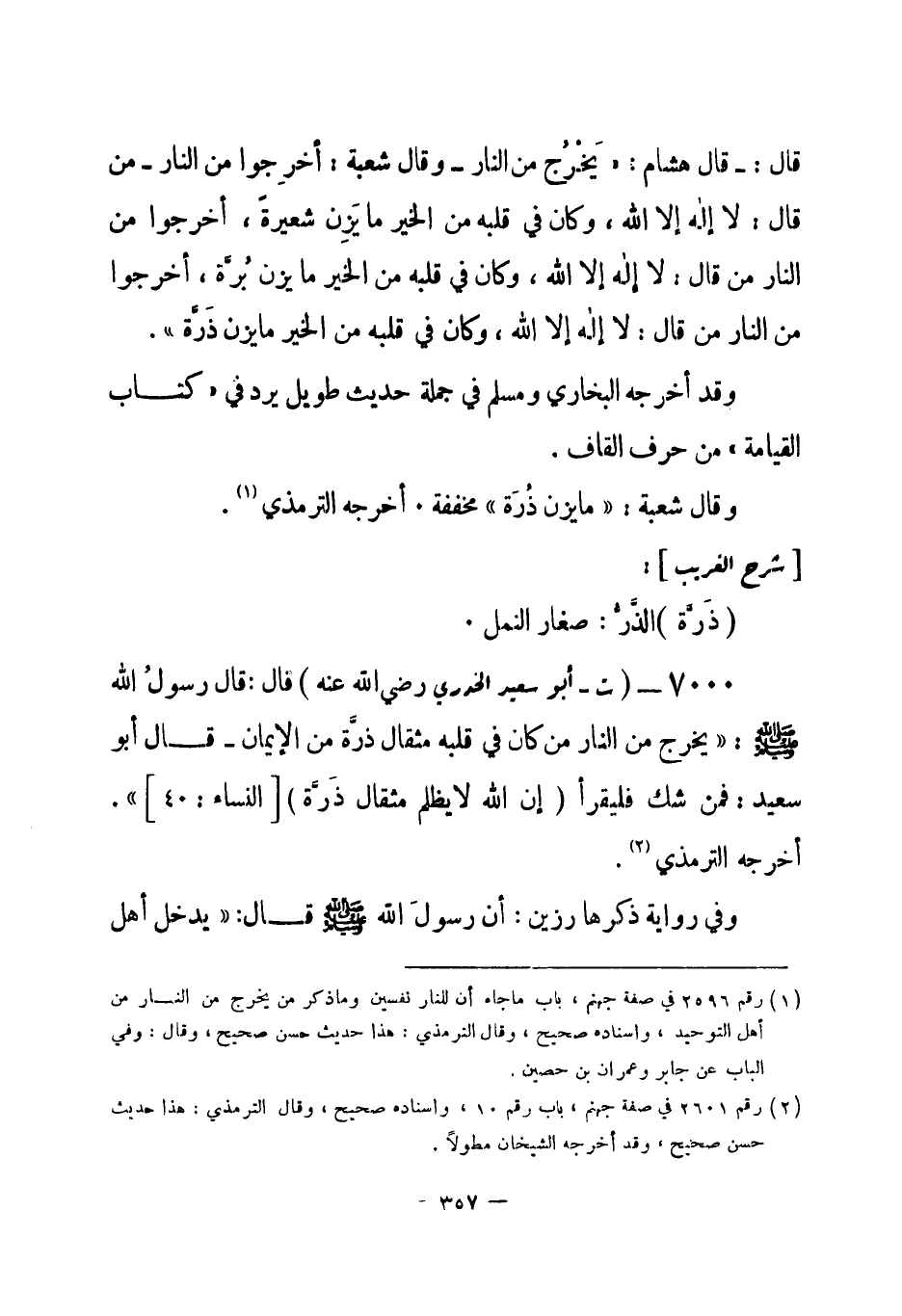 (¬1) رقم (2601) في صفة جهنم، باب رقم (10) ، وإسناده صحيح، وقال الترمذي: هذا حديث حسن صحيح، وقد أخرجه الشيخان مطولاً.