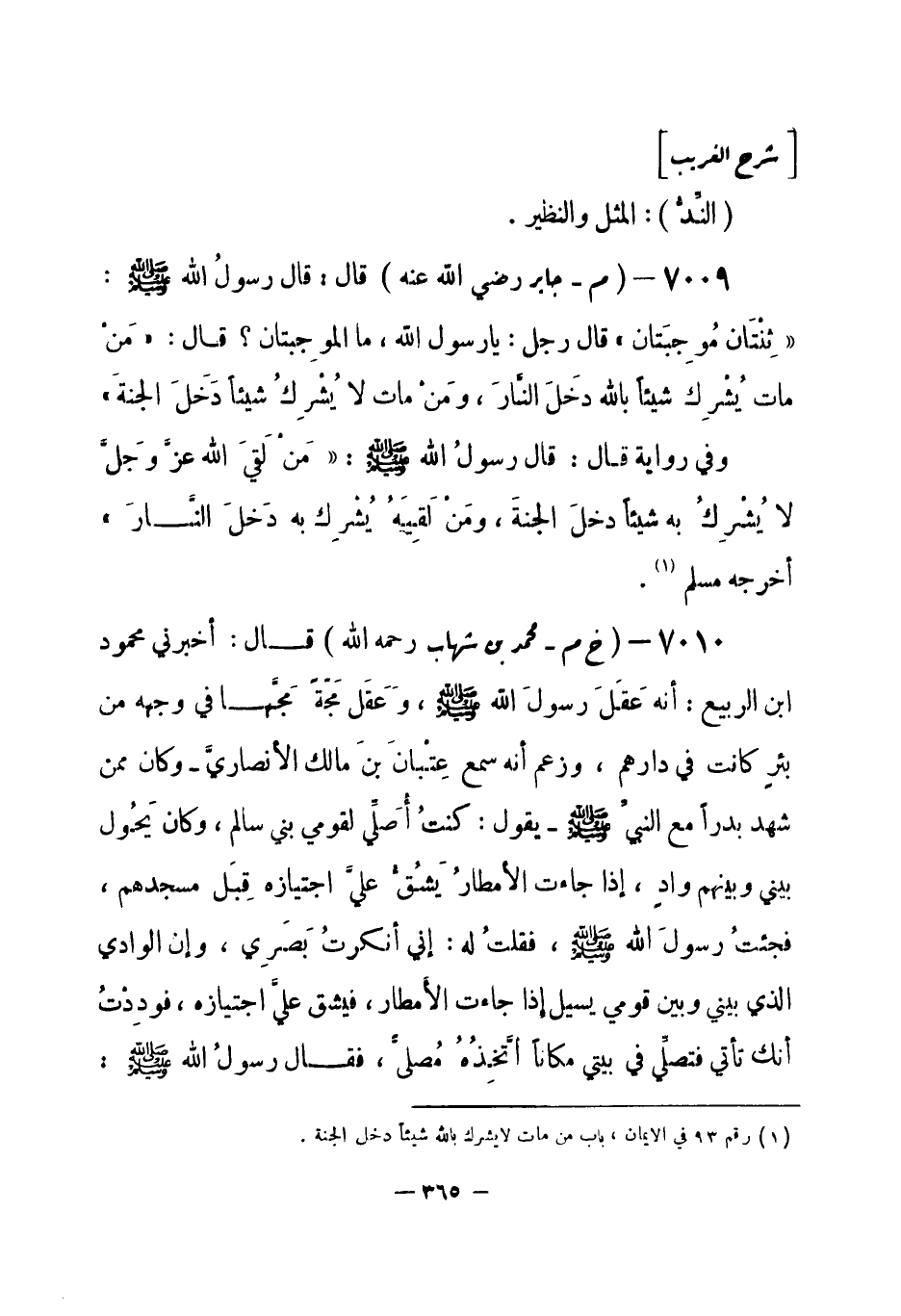(¬1) رواه البخاري 2 / 132 في صلاة الجماعة، باب الرخصة في المطر والعلة، وباب إذا زار الإمام قوماً فأمهم، وفي المساجد، باب إذا دخل بيتاً يصلي حيث شاء وحيث أمر، وباب المساجد في البيوت، وفي صفة الصلاة، باب يسلم حين يسلم الإمام، وباب من لم يرد السلام على الإمام، وفي التطوع، باب صلاة النوافل جماعة، وفي المغازي، باب شهود الملائكة بدراً، وفي الأطعمة، باب الخزيرة، وفي الرقاق، باب العمل الذي ابتغى به وجه الله، وفي استتابة المرتدين والمعاندين، باب ما جاء في المتأولين، ومسلم رقم (33) في الإيمان، باب الدليل على من مات على التوحيد دخل الجنة قطعاً.