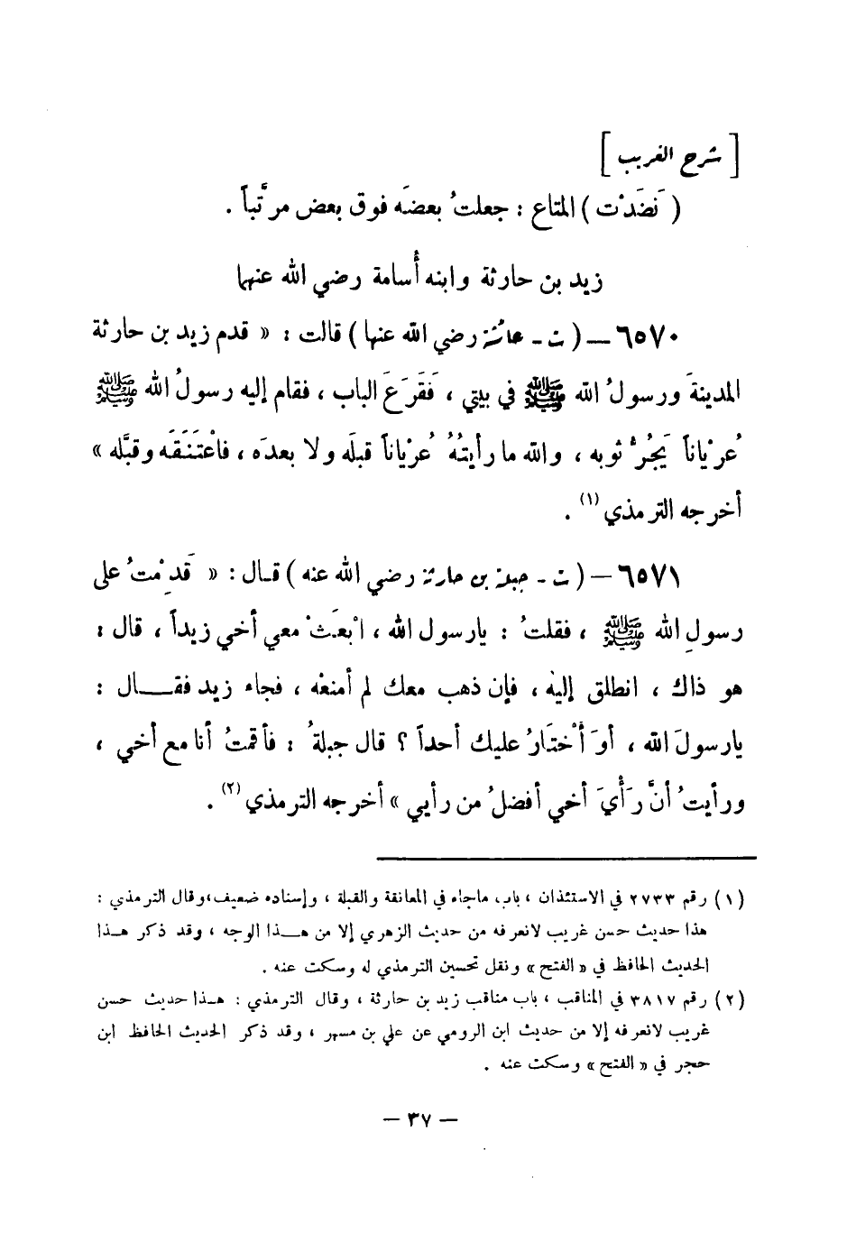 (¬1) رقم (3817) في المناقب، باب مناقب زيد بن حارثة، وقال الترمذي: هذا حديث حسن غريب لا نعرفه إلا من حديث ابن الرومي عن علي بن مسهر، وقد ذكر الحديث الحافظ ابن حجر في " الفتح " وسكت عنه.