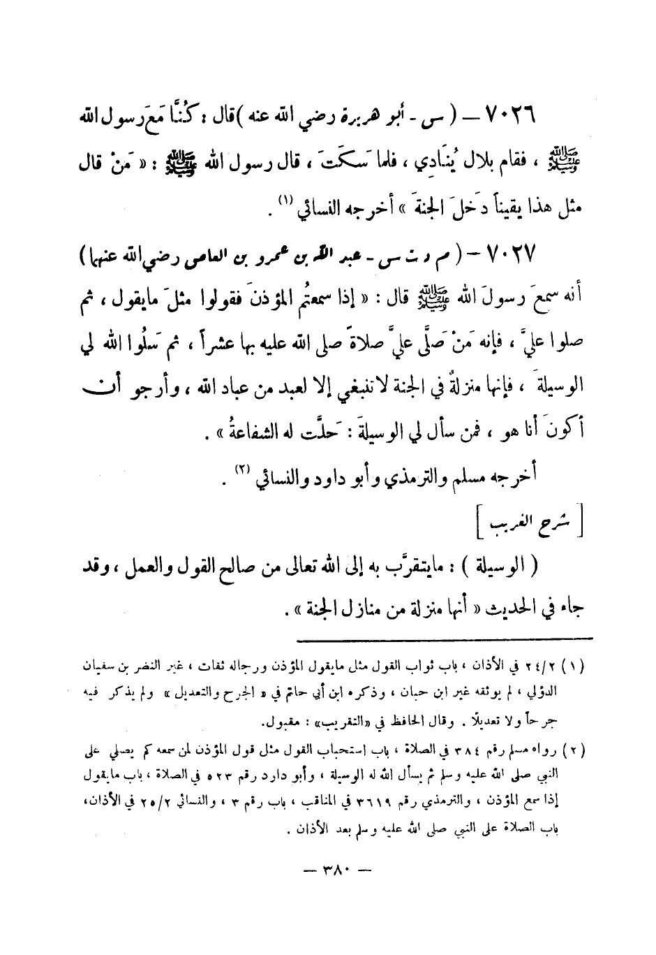 7027 - (م د ت س) عبد الله بن عمرو بن العاص - رضي الله عنهما - أنه سمع رسولَ الله - صلى الله عليه وسلم- قال: «إذا سمعتُم المؤذِّنَ فقولوا مثلَ ما يقول، ثم صلوا عليَّ، فإنه مَنْ صلَّى عليَّ صلاة صلى الله عليه بها عشراً، ثم سَلُوا الله لي الوسيلةَ، فإنها منزلة في الجنة لا تنبغي إلا لعبد من عباد الله، وأرجو أن أكونَ أنا هو، فمن سأل الله لي الوسيلةَ: حلَّت له الشفاعةُ» .