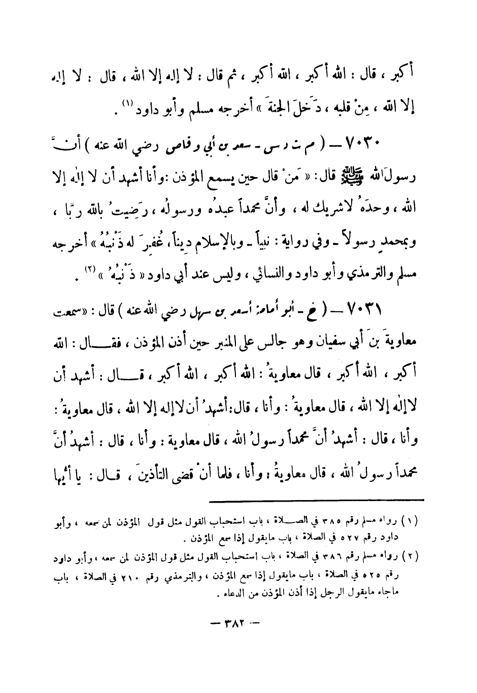 7030 - (م ت د س) سعد بن أبي وقاص - رضي الله عنه - أن رسولَ الله - صلى الله عليه وسلم- قال: «مَنْ قال حين يسمع المؤذن: وأنا أشهد أن لا إله إلا الله، وحدَهُ لا شريك له، وأنَّ محمداً عبدُه ورسولُه، رَضِيتُ بالله ربّاً، وبمحمد رسولاً - وفي رواية: نبياً - وبالإسلام دِيناً، غُفِرَ له ذَنْبُه» أخرجه مسلم والترمذي، وأبو داود والنسائي، وليس عند أبي داود «ذَنْبُه» (¬1) .