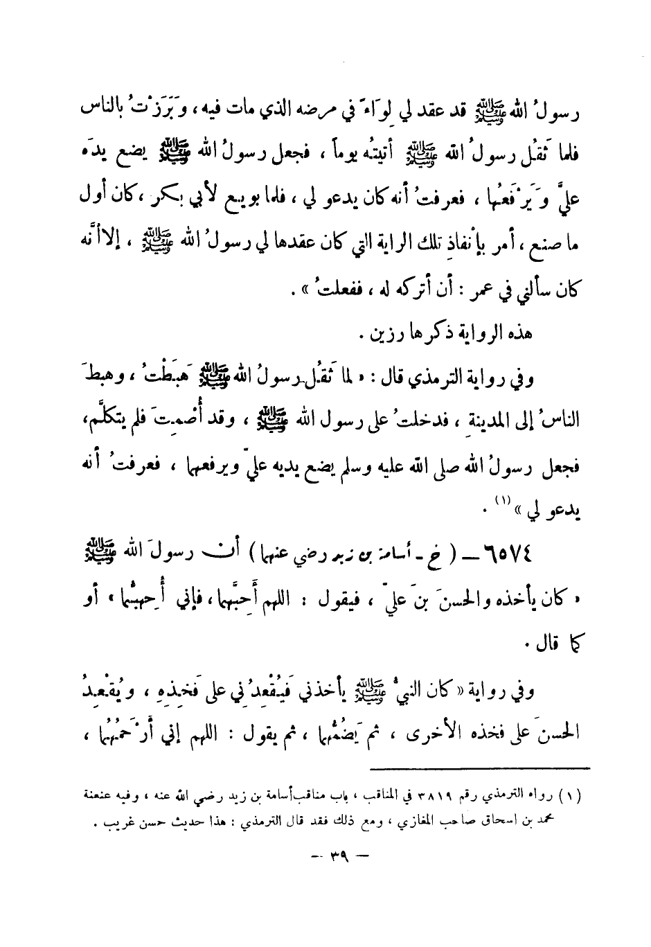 6574 - (خ) أسامة بن زيد - رضي الله عنهما - أن رسولَ الله - صلى الله عليه وسلم- كان يأخذه والحسنَ بنَ عليّ، فيقول: «اللهم أحِبَّهما، فإني أُحِبُّهما» أو كما قال.