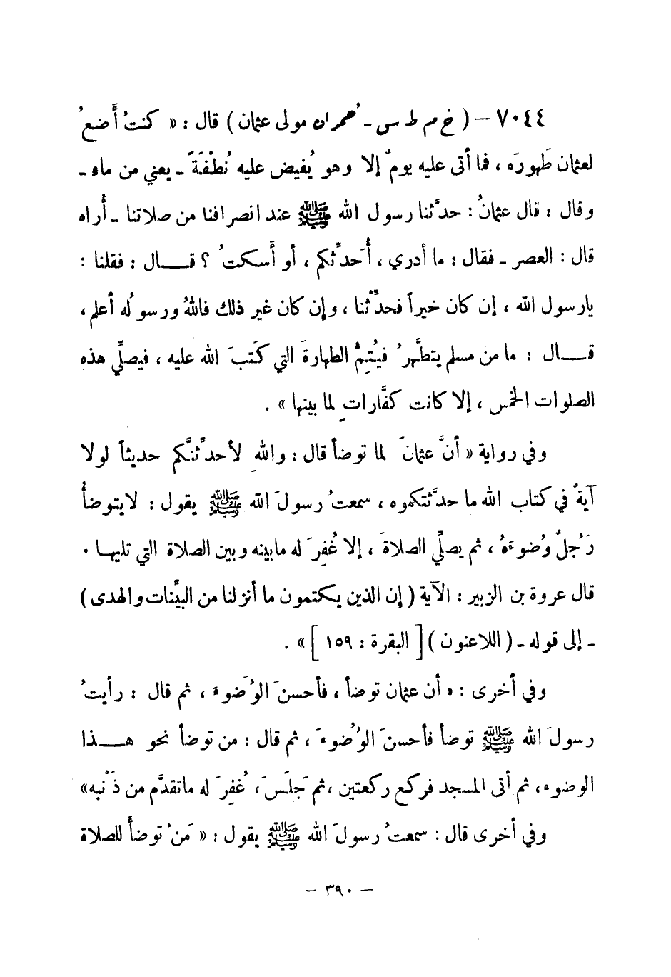 وفي رواية: أنَّ عثمانَ لما توضأ قال: واللهِ لأحدِّثنَّكم حديثاً لولا آية في كتاب الله ما حدَّثتكموه، سمعتُ رسولَ الله - صلى الله عليه وسلم- يقول: «لا يتوضأ رَجُل وُضوءه، ثم يصلِّي الصلاةَ، إلا غُفِرَ له ما بينه وبين الصلاة التي تليها. قال عروة بن الزبير: الآية {إن الذين يكتمون ما أنزلنا من البيِّنات والهدى} إلى قوله {اللاعنون} [البقرة: 159] » .
