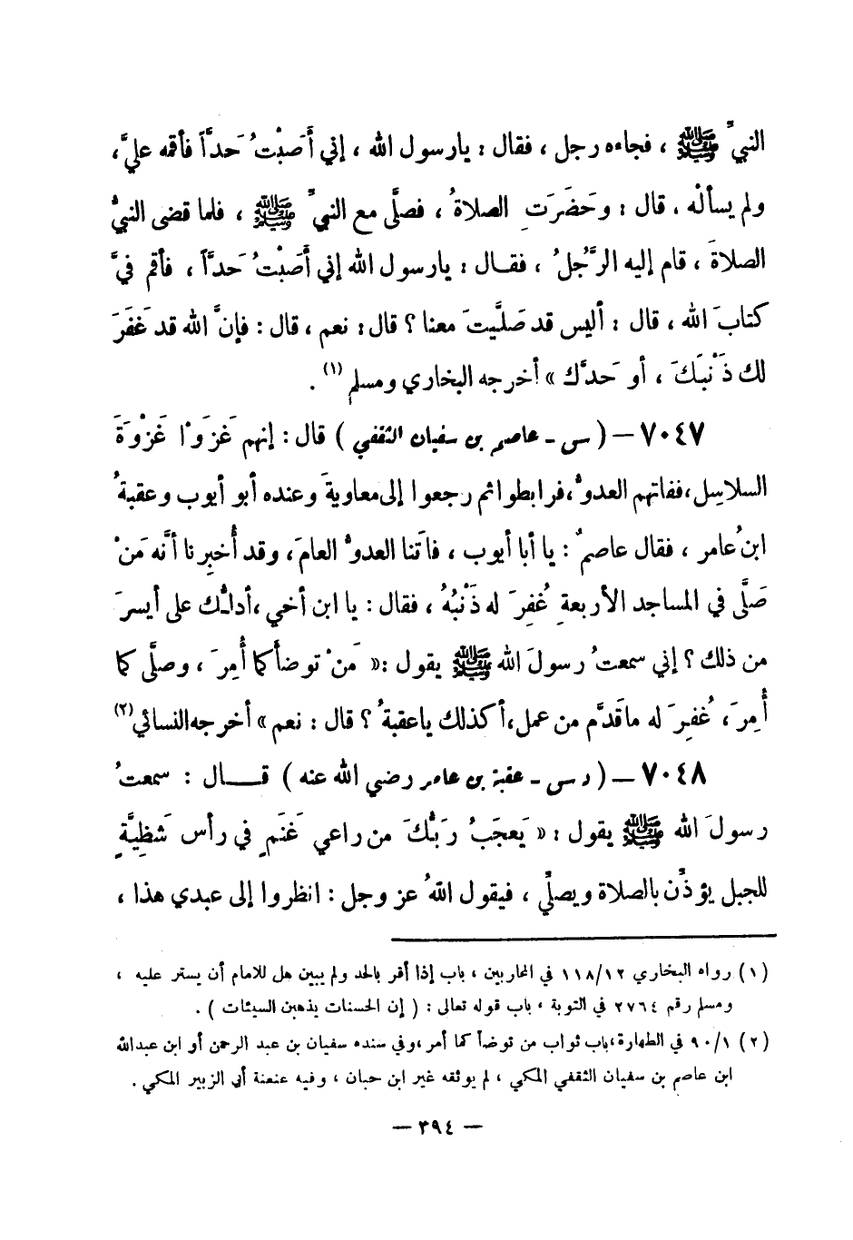 7048 - (د س) عقبة بن عامر - رضي الله عنه - قال: سمعتُ رسولَ الله - صلى الله عليه وسلم- يقول: «يَعجَبُ رَبُّكَ من راعي غَنَم في رأس شَظيَّة للجبل يؤذِّن بالصلاة ويصلِّي، فيقول الله عز وجل: انظروا إلى عبدي هذا، -[395]- يؤذِّن ويقيمُ الصلاة، يخاف مِنِّي، قد غفرتُ لعبدي وأدخلتُه الجنةَ» . أخرجه أبو داود والنسائي (¬1) .