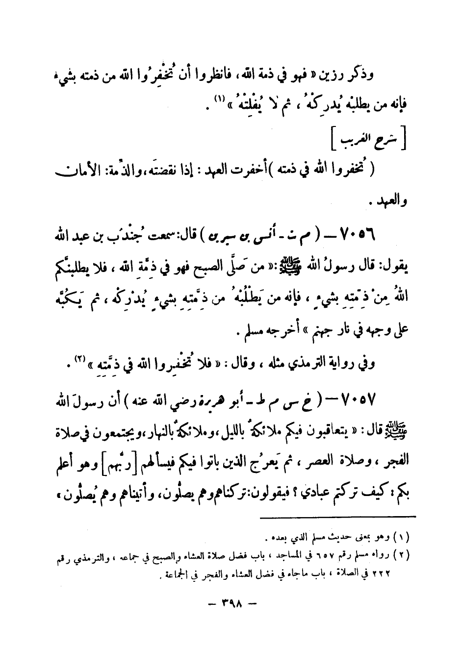 7056 - (م ت) أنس بن سيرين: قال: سمعت جُنْدُب بن عبد الله يقول: قال رسولُ الله - صلى الله عليه وسلم-: «من صَلَّى الصبح فهو في ذِمَّةِ الله، فلا يطلبنَّكم الله مِنْ ذِمَّتِهِ بِشيء، فإنه من يَطْلُبْهُ من ذِمَّتِه بشيء يُدْرِكْه، ثم يَكُبَّه على وجهه في نار جهنم» أخرجه مسلم. وفي رواية الترمذي مثله، وقال: «فلا تُخْفِروا الله في ذِمَّتِه» (¬1) .