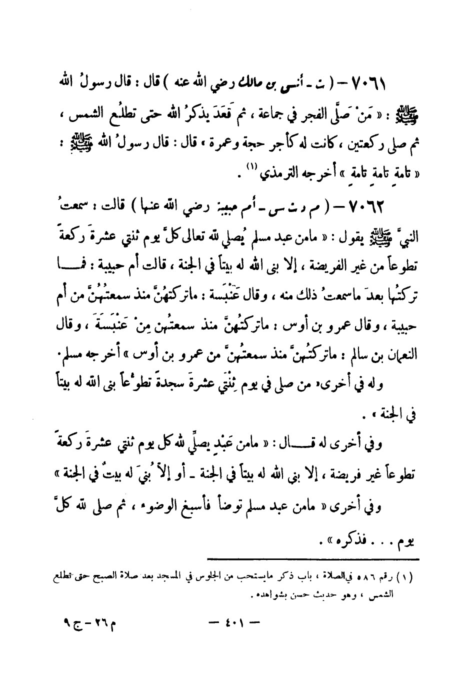 7062 - (م د ت س) أم حبيبة - رضي الله عنها - قالت: سمعتُ النبيَّ - صلى الله عليه وسلم- يقول: «ما من عبد مسلم يُصلي لله تعالى كلَّ يوم ثنتي عشرةَ ركعة تطوعاً من غير الفريضة، إلا بنى الله له بيتاً في الجنة، قالت أم حبيبة: فما تركتُها بعدَ ما سمعتُ ذلك منه، وقال عَنْبَسة: ما تركتهُنَّ منذ سمعتُهُنَّ من أم حبيبة، وقال عمرو بن أوس: ما تركتُهنَّ منذ سمعتُهن مِن عَنْبَسَةَ، وقال النعمان بن سالم: ما تركتُهنَّ منذ سمعتهنَّ من عمرو بن أوس» أخرجه مسلم.