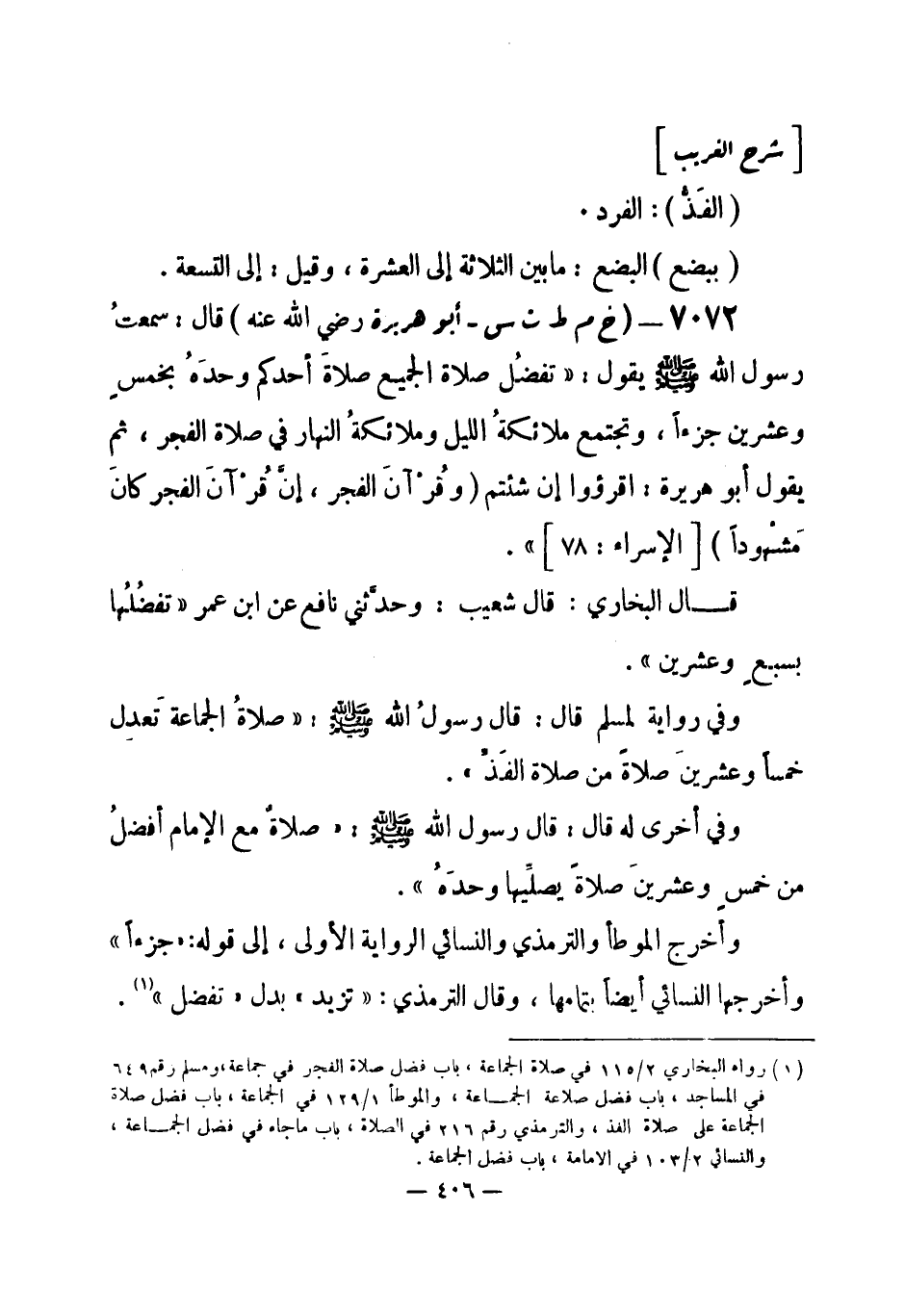 (¬1) رواه البخاري 2 / 115 في صلاة الجماعة، باب فضل صلاة الفجر في جماعة، ومسلم رقم (649) في المساجد، باب فضل صلاة الجماعة، والموطأ 1 / 129 في الجماعة، باب فضل صلاة الجماعة على صلاة الفذ، والترمذي رقم (216) في الصلاة، باب ما جاء في فضل الجماعة، والنسائي 2 / 103 في الإمامة، باب فضل الجماعة.