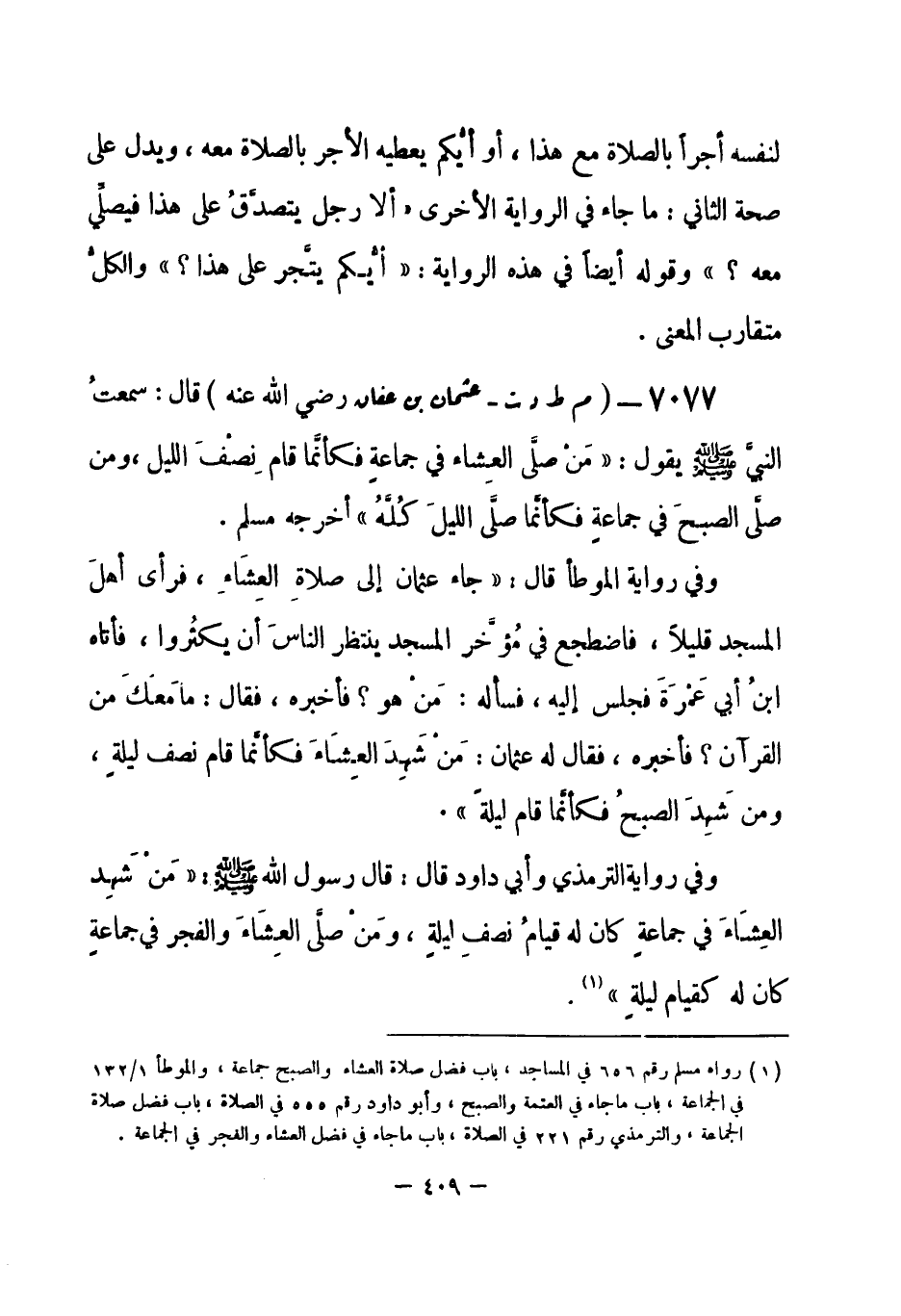 7077 - (م ط د ت) عثمان بن عفان - رضي الله عنه - قال: سمعتُ رسولَ الله - صلى الله عليه وسلم- يقول: «مَنْ صَلَّى العِشاء في جماعة فكأنَّما قام نِصْفَ الليل، ومن صلَّى الصبحَ في جماعة فكأنَّما صلَّى الليلَ كُلَّهُ» أخرجه مسلم.
