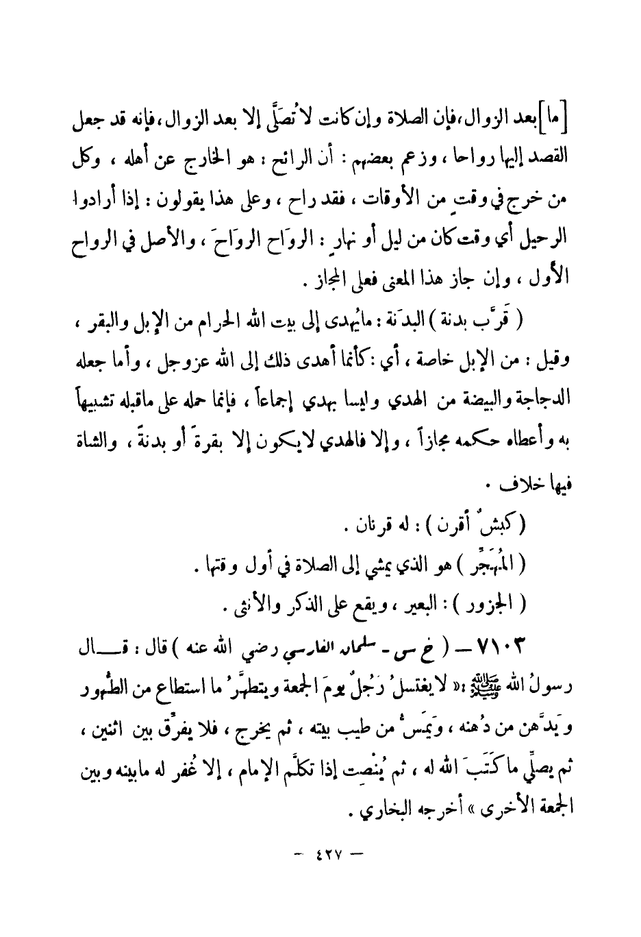 7103 - (خ س) سلمان الفارسي - رضي الله عنه -: قال: قال رسولُ الله - صلى الله عليه وسلم-: «لا يغتسلُ رَجُل يومَ الجمعة ويتطهَّرُ ما استطاع من الطُّهور ويَدَّهن من دُهنه، ويَمَسُّ من طيب بيته، ثم يخرج، فلا يفرِّق بين اثنين، ثم يصلِّي ما كَتَبَ الله له، ثم يُنْصِت إِذا تكلَّم الإِمام، إِلا غُفر له ما بينه وبين الجمعة الأخرى» . أخرجه البخاري. -[428]-