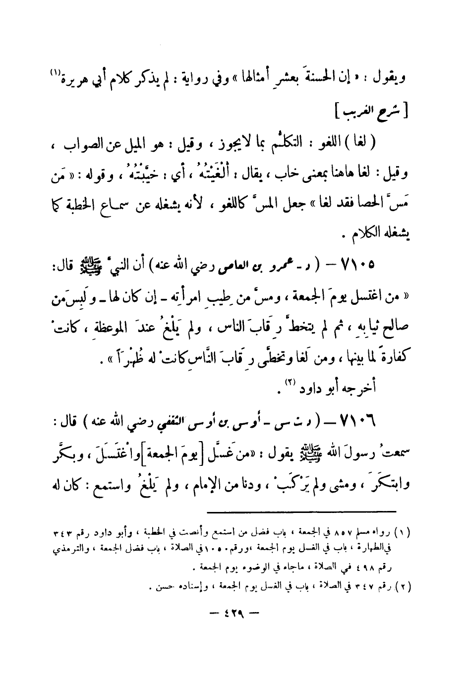 7105 - (د) عمرو بن العاص - رضي الله عنه -: أن النبيَّ - صلى الله عليه وسلم- قال: «من اغتسل يومَ الجمعة، ومسَّ من طِيبِ امرأتِهِ - إن كان لها - وَلَبِسَ مِن صالحِ ثيابِهِ، ثم لم يَتخطَّ رِقَابَ الناس، ولم يَلْغُ عندَ الموعظةِ، كانتْ كفارة لما بينها، ومن لَغا وتخطَّى رِقَابَ النَّاسِ كانتْ له ظُهْراً» . أخرجه أبو داود (¬1) .
