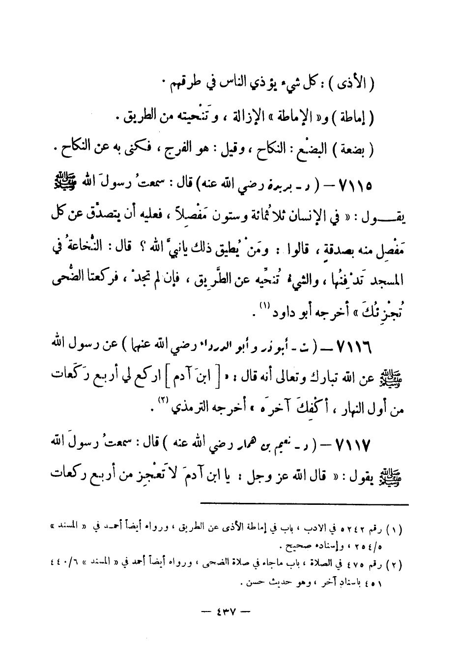 7116 - (ت) أبو ذر وأبو الدرداء - رضي الله عنهما -: عن رسول الله - صلى الله عليه وسلم- عن الله تبارك وتعالى أنه قال: « [ابنَ آدم] اركع لي أربع رَكَعات من أول النهار، أكْفِكَ آخرَه» أخرجه الترمذي (¬1) .