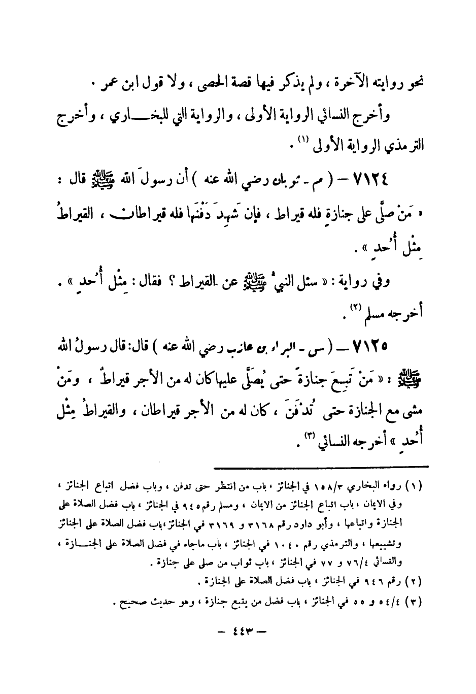7125 - (س) البراء بن عازب - رضي الله عنه - قال: قال رسولُ الله - صلى الله عليه وسلم-: «مَنْ تَبِعَ جنازة حتى يُصَلَّى عليها كان له من الأجر قيراط، ومَنْ مشى مع الجنازة حتى تُدْفَنَ، كان له من الأجر قيراطان، والقيراطُ مِثْلُ أحُد» أخرجه النسائي (¬1) .
