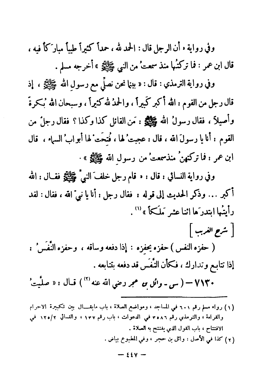 7130 - (س) وائل بن حجر - رضي الله عنه (¬1) - قال: «صلَّيتُ -[448]- خلفَ رسولِ الله - صلى الله عليه وسلم-، فلما كبَّر رفع يديه أسفلَ من أذُنيه، فلما قرأ {غيرِ المغضوب عليهم ولا الضَّالين} قال: آمين، فسمعتُه وأنا خلفَهُ، فسمع رسولُ الله - صلى الله عليه وسلم- رجلاً يقول: الحمد لله حمداً كثيراً طيباً مباركاً فيه، فلما سلَّم النبيُّ من صلاته، قال: مَنْ صاحب الكلمة في الصلاة؟ قال الرجلُ: أنا يا رسول الله، وما أردتُ بها بأساً، فقال النبيُّ - صلى الله عليه وسلم-: لقد ابتدرها اثنا عشر مَلَكاً، فما نهنهها شيءٌ دون العرش» . أخرجه النسائي (¬2) .