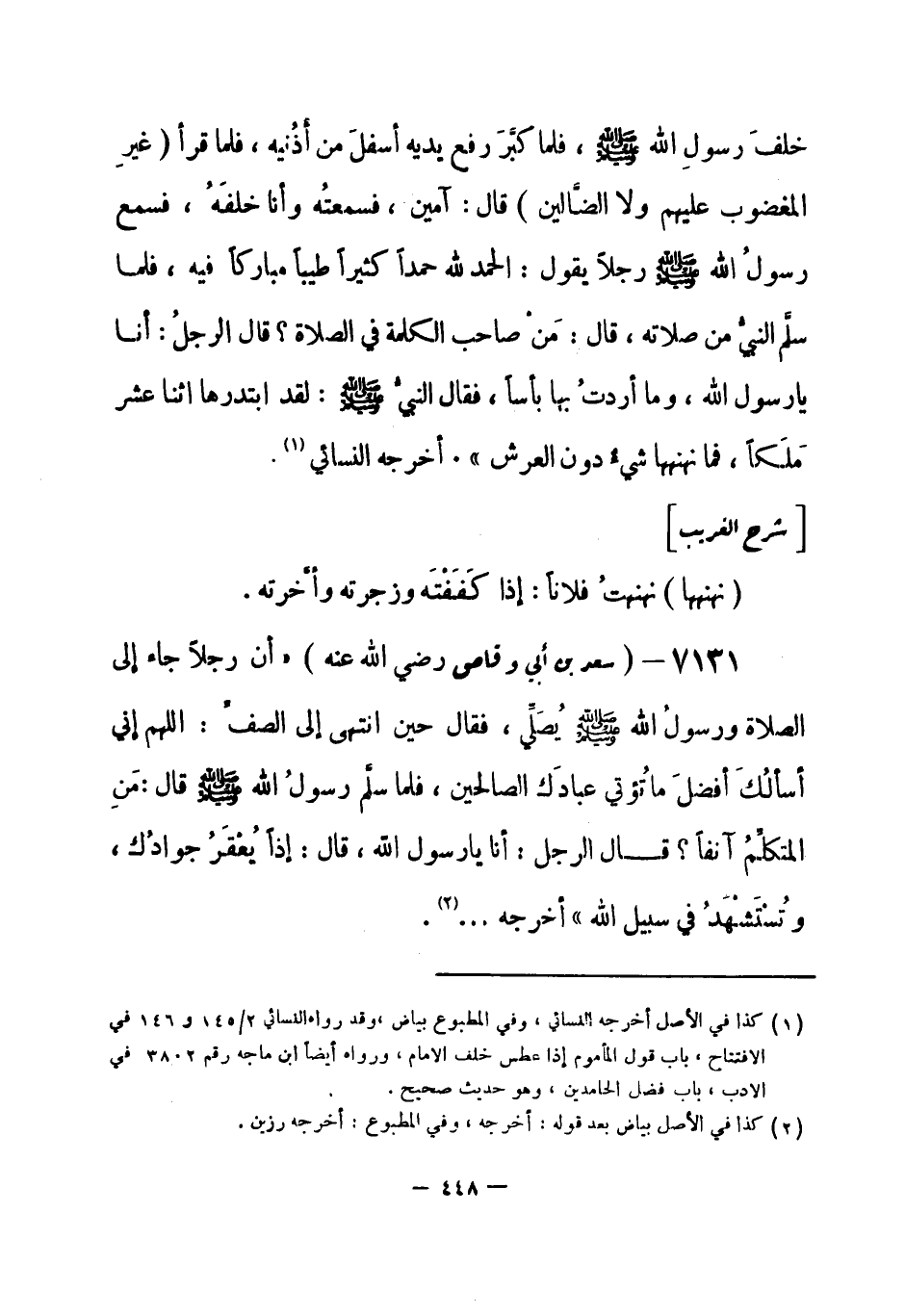 7131 - () سعد بن أبي وقاص - رضي الله عنه -: «أن رجلاً جاء إلى الصلاة ورسولُ الله - صلى الله عليه وسلم- يُصَلِّي، فقال حين انتهى إلى الصف: اللهم إني أسألُكَ أفضلَ ما تُؤتي عبادَك الصالحين، فلما سلَّم رسولُ الله - صلى الله عليه وسلم- قال: مَنِ المتكلِّمُ آنفاً؟ قال الرجل: أنا يا رسول الله، قال: إذاً يُعْقَرُ جوادُك، وتُسْتَشْهَدُ في سبيل الله» . أخرجه ... (¬1) . -[449]-