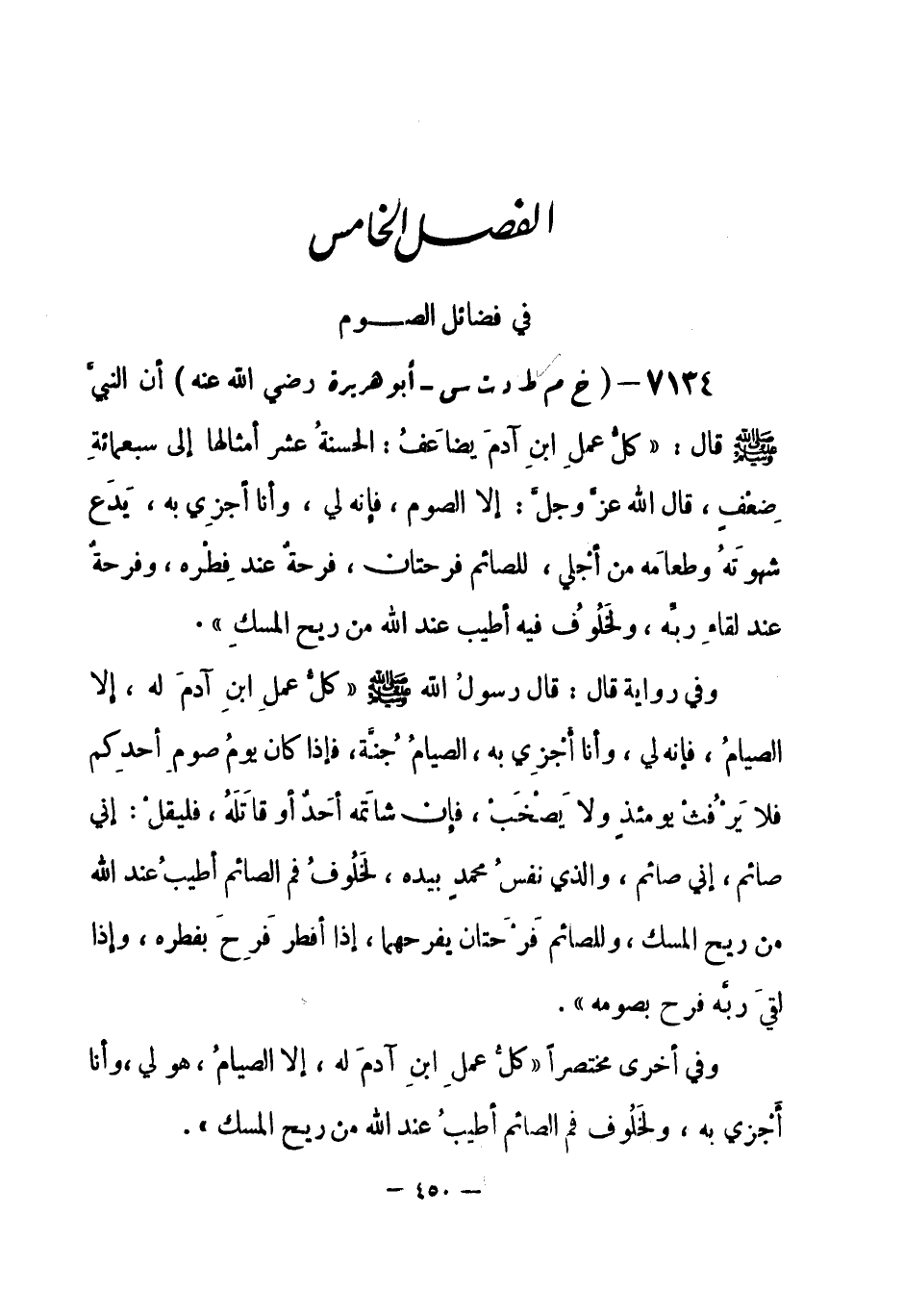 وفي أخرى مختصراً: «كلُّ عملِ ابنِ آدمَ له، إلا الصيامُ، هو لي، وأنا أجزي به، ولَخَلُوف فم الصائم أطيبُ عند الله من ريح المسك» . -[451]-