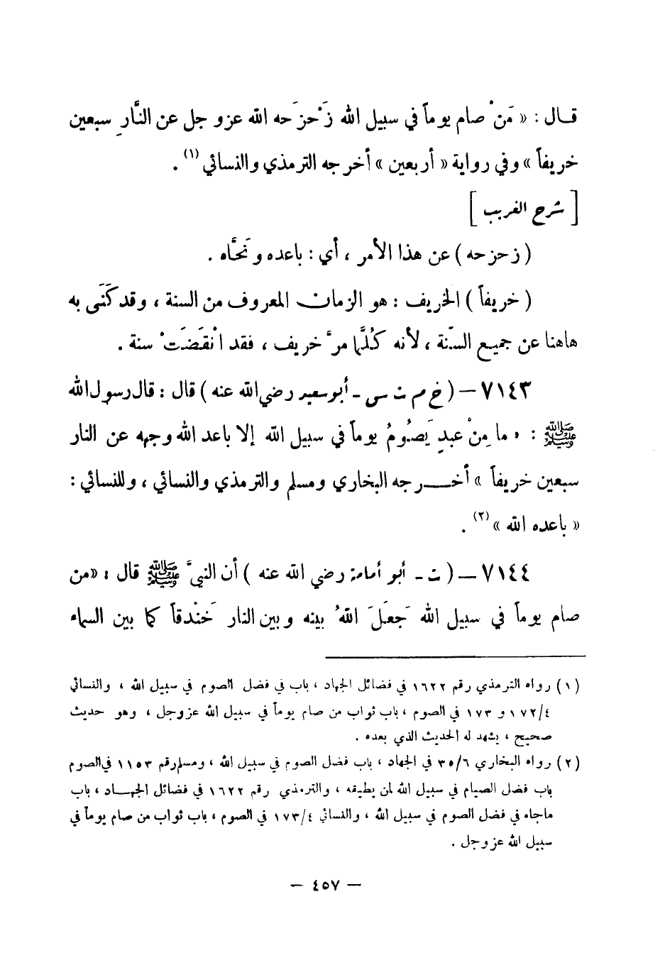 7143 - (خ م ت س) أبو سعيد - رضي الله عنه - قال: قال رسولُ الله - صلى الله عليه وسلم-: «ما مِنْ عبد يَصُومُ يوماً في سبيل الله إلا باعد الله وجهه عن النار سبعين خريفاً» أخرجه البخاري ومسلم، والترمذي، والنسائي، وللنسائي «باعده الله» (¬1) .