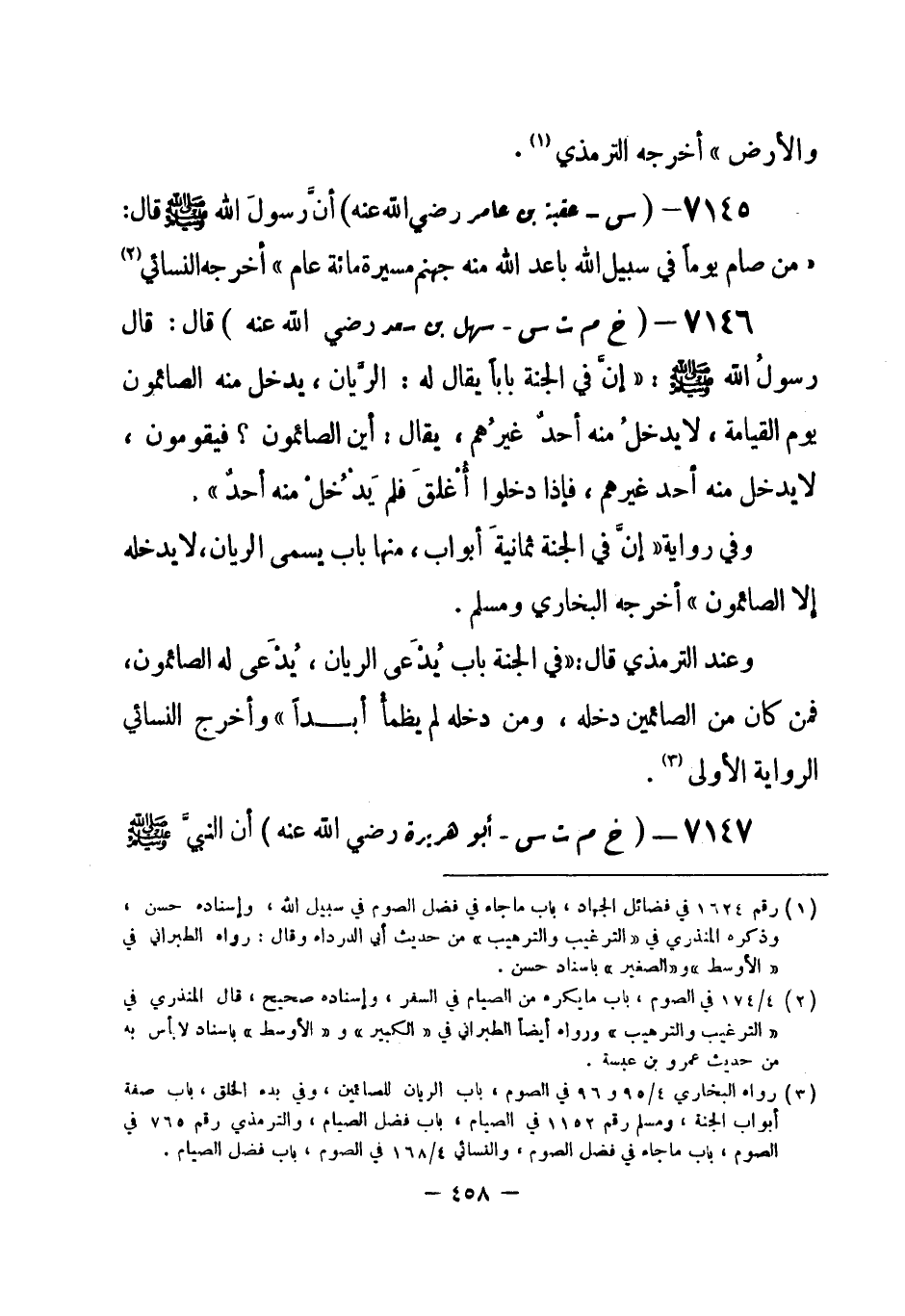 7145 - (س) عقبة بن عامر - رضي الله عنه - أن رسولَ الله - صلى الله عليه وسلم- قال: «من صام يوماً في سبيل الله باعد الله منه جهنم مسيرة مائة عام» أخرجه النسائي (¬1) .