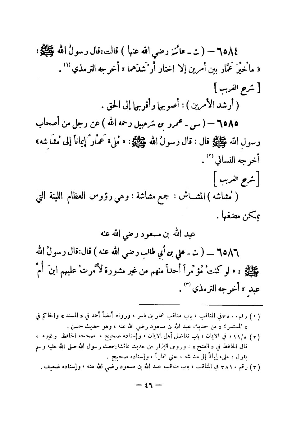6584 - (ت) عائشة - رضي الله عنها - قالت: قال رسولُ الله - صلى الله عليه وسلم-: «ما خُيِّرَ عَمَّار بين أمرين إلا اختار أرْشَدَهما» أخرجه الترمذي (¬1) .