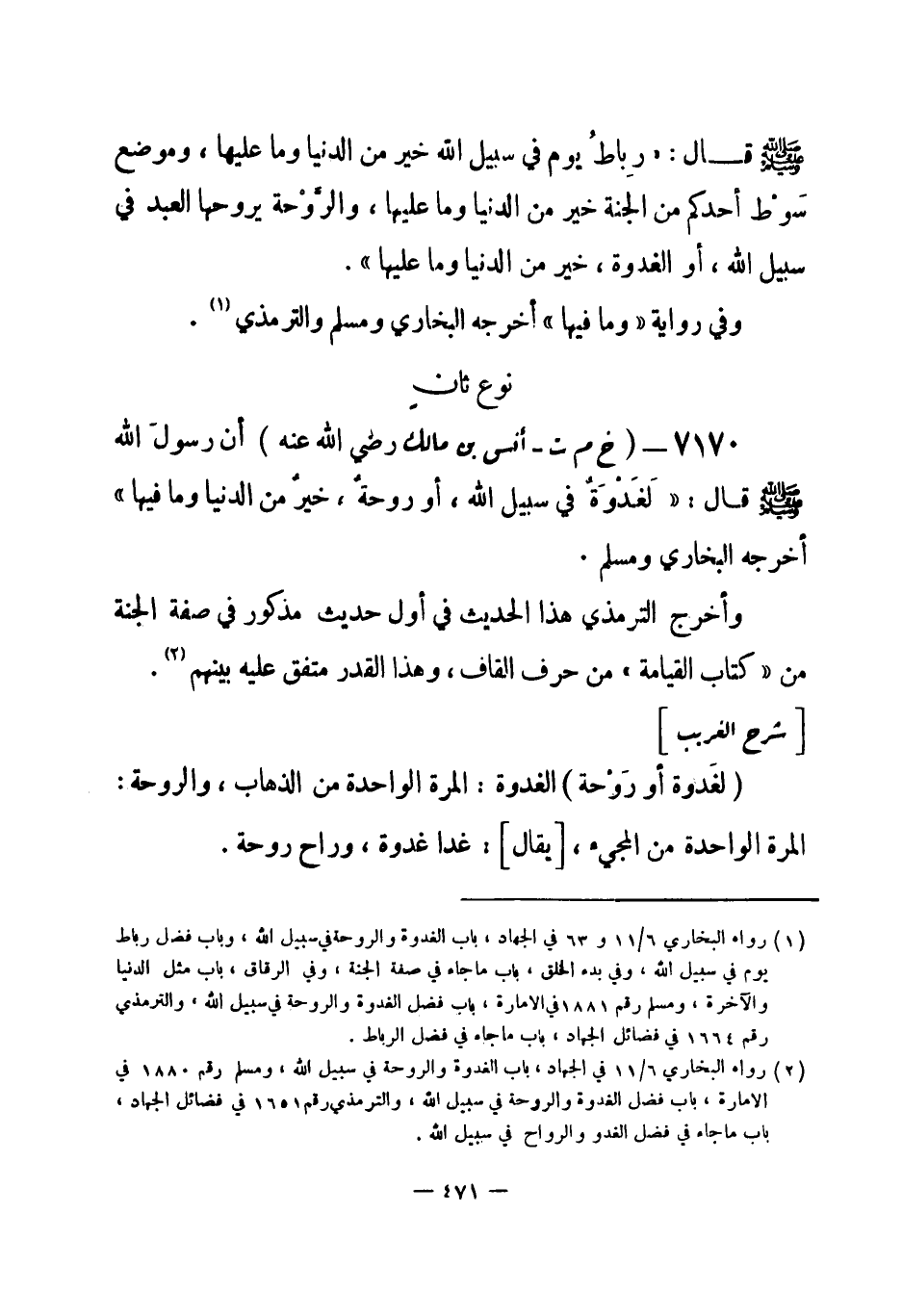 (¬1) رواه البخاري 6 / 11 في الجهاد، باب الغدوة والروحة في سبيل الله، ومسلم رقم (1880) في الإمارة، باب فضل الغدوة والروحة في سبيل الله، والترمذي رقم (1651) في فضائل الجهاد، باب ما جاء في الغدو والرواح في سبيل الله.
