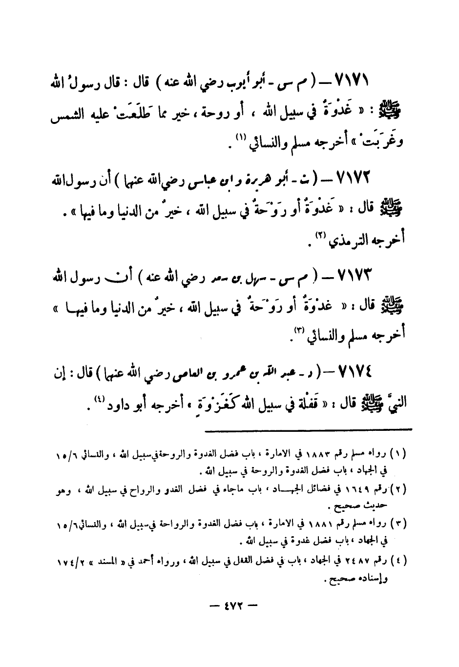 (¬1) رواه مسلم رقم (1883) في الإمارة، باب فضل الغدوة والروحة في سبيل الله، والنسائي 6 / 15 في الجهاد، باب فضل الغدوة والروحة في سبيل الله.