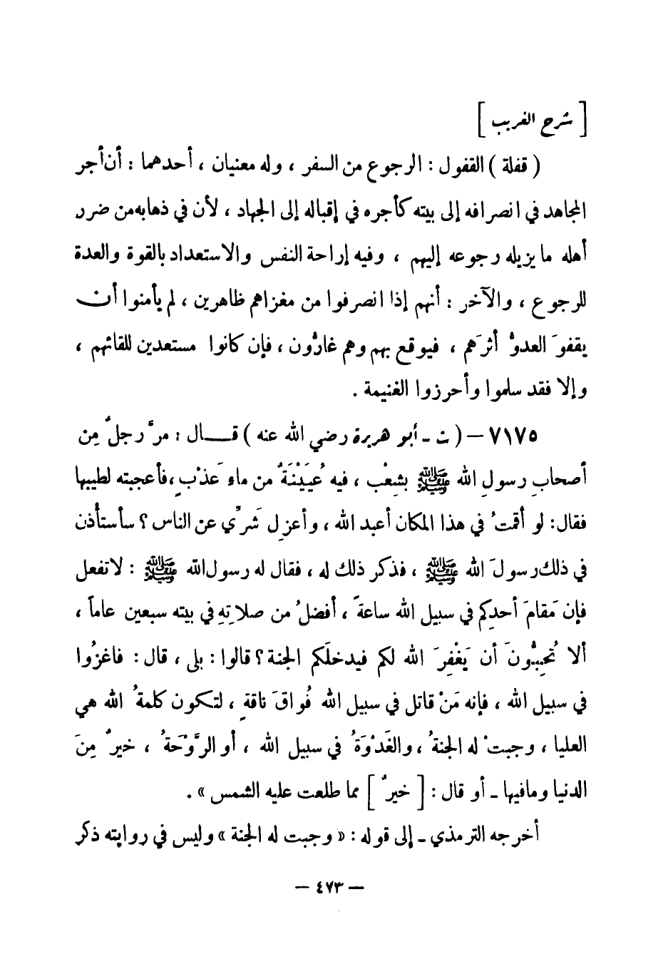 7175 - (ت) أبو هريرة - رضي الله عنه - قال: «مرَّ رجل مِنْ أصحابِ رسولِ الله - صلى الله عليه وسلم- بشِعْب، فيه عُيَيْنَة من ماء عَذْب، فأعجبته لطيبها فقال: لو أقمتُ في هذا المكان أعبد الله، وأعزِل شَرِّي عن الناس؟ سأستأذن في ذلك رسولَ الله - صلى الله عليه وسلم-، فذكر ذلك له، فقال له رسولُ الله - صلى الله عليه وسلم-: لا تفعل فإن مَقامَ أحدِكم في سبيل الله ساعة، أفضلُ من صلاتِهِ في بيته سبعين عاماً، ألا تُحِبُّون أن يَغْفِرَ الله لكم فيدخلَكم الجنة؟ قالوا: بلى، قال: فاغزُوا في سبيل الله، فإنه مَنْ قاتل في سبيل الله فُواقَ ناقة، لتكون كلمةُ الله هي العليا، وجبتْ له الجنةُ، والغَدْوَةُ في سبيل الله، أو الرَّوْحةُ، خير مِنَ الدنيا وما فيها أو قال: [خير] مما طلعت عليه الشمس» .