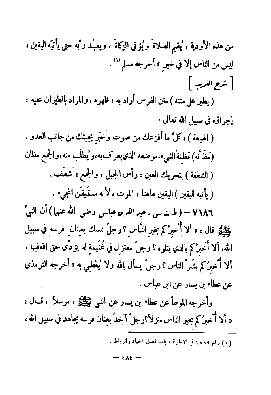 7186 - (ط ت س) عبد الله بن عباس - رضي الله عنهما -: أن النبيَّ - صلى الله عليه وسلم- قال: «ألا أُخْبِرُكم بخيرِ النَّاسِ؟ رجل ممسك بعِنان فرسِه في سبيل الله، ألا أُخْبِرُكم بالذي يتلوه؟ رجل معتزِل في غُنَيمة له يؤدِّي حق الله فيها، ألا أُخْبِرُكم بشَرِّ الناس؟ رجل يسأل بالله ولا يُعْطِي به» أخرجه الترمذي عن عطاء بن يسار عن ابن عباس.