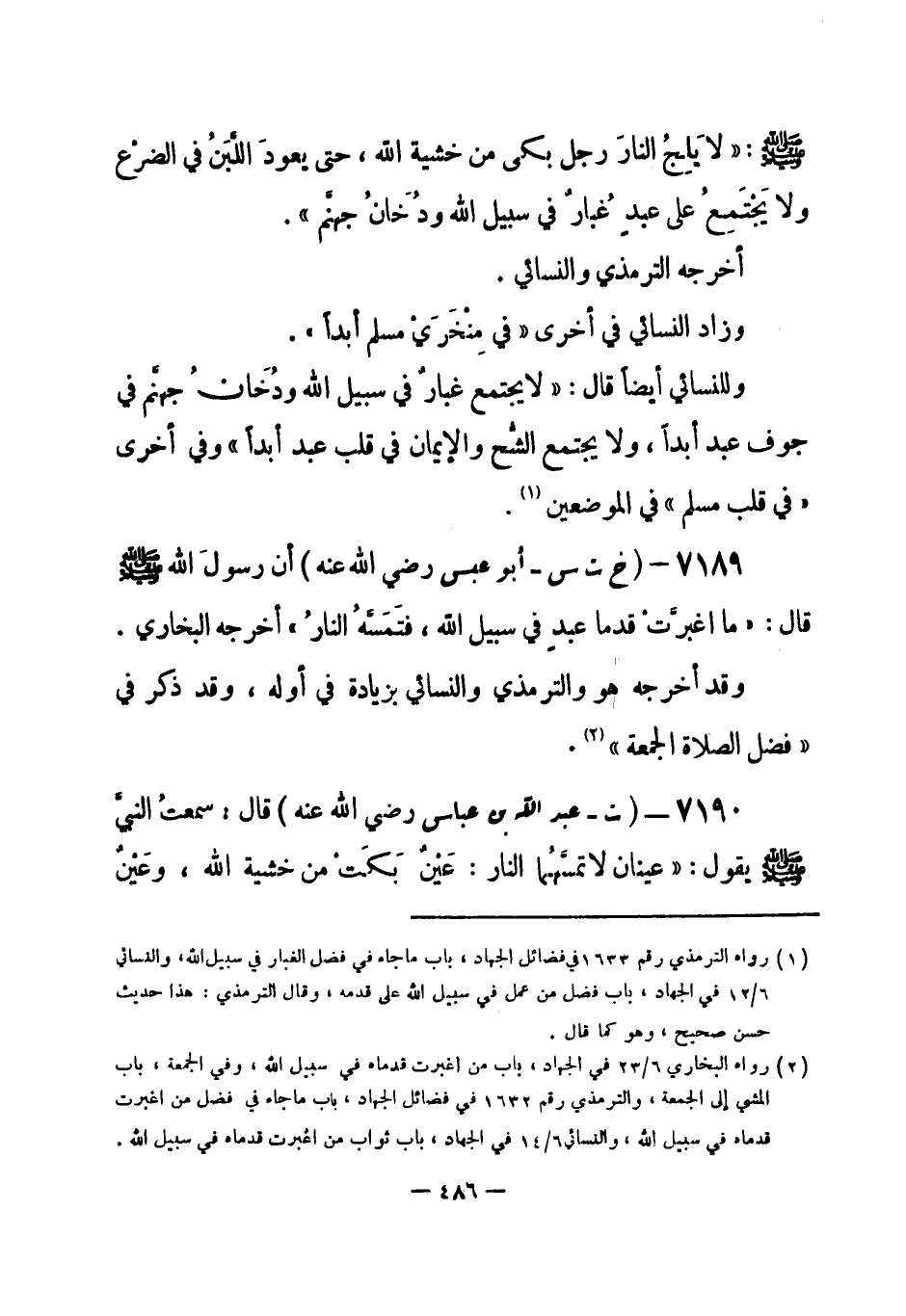 7189 - (خ ت س) أبو عبس - رضي الله عنه - أن رسولَ الله - صلى الله عليه وسلم- قال: «ما اغبرَّتْ قدما عبد في سبيل الله، فتَمَسَّه النارُ» أخرجه البخاري.