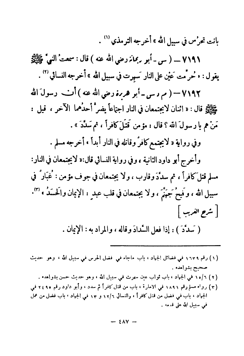 7192 - (م د س) أبو هريرة - رضي الله عنه - أن رسولَ الله - صلى الله عليه وسلم- قال: «اثنان لا يجتمعان في النار اجتماعاً يضرُّ أحدُهما الآخر، قيل: مَنْ هم يا رسولَ الله؟ قال: مؤمن قَتَلَ كافراً، ثم سَدَّد» .