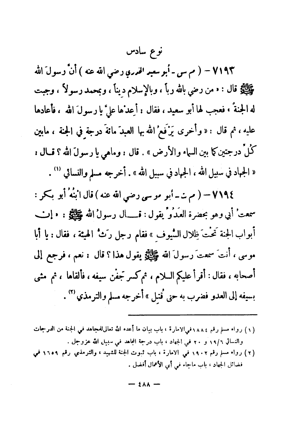 (¬1) رواه مسلم رقم (1884) في الإمارة، باب بيان ما أعده الله تعالى للمجاهد في الجنة من الدرجات، والنسائي 6 / 19 و 20 في الجهاد، باب درجة المجاهد في سبيل الله عز وجل.