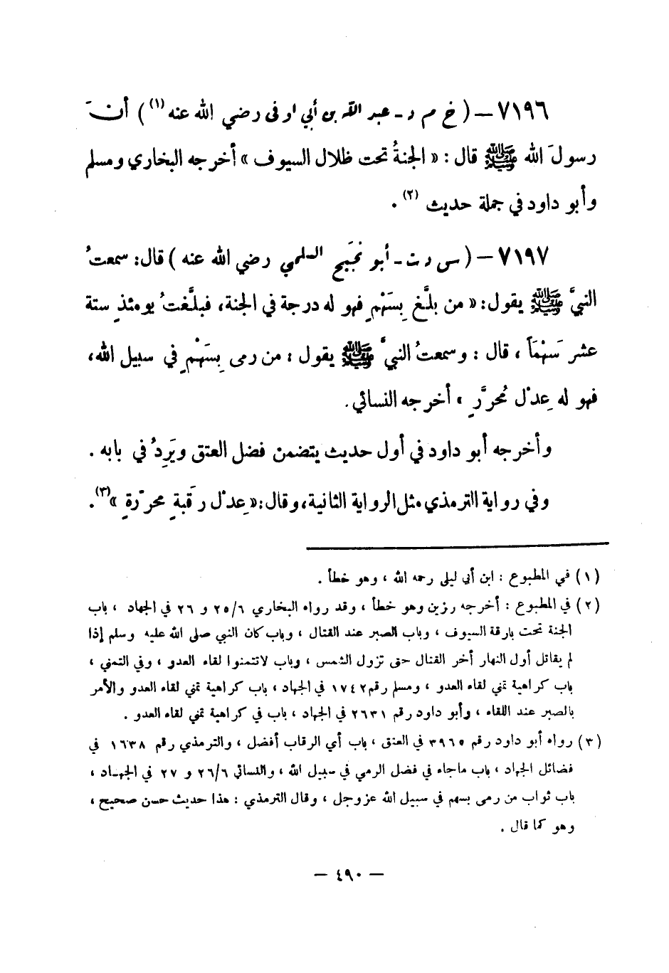 7196 - (خ م د) عبد الله بن أبي أوفى - رضي الله عنه (¬1) -: أن رسولَ الله - صلى الله عليه وسلم- قال: «الجنةُ تحت ظلال السيوف» أخرجه البخاري ومسلم وأبو داود في جملة حديث (¬2) .