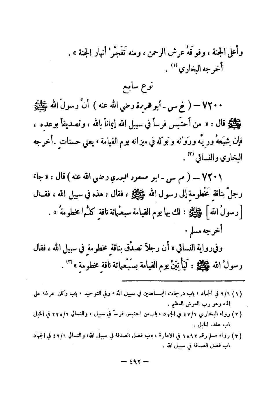 7201 - (م س) أبو مسعود البدري - رضي الله عنه - قال: جاء رجل بناقة مَخْطومة إلى رسولِ الله - صلى الله عليه وسلم-، فقال: هذه في سبيل الله، فقال [رسولُ الله]- صلى الله عليه وسلم-: لك بها يوم القيامة سبعُمائة ناقة كلُّها مخطومة. أخرجه مسلم.