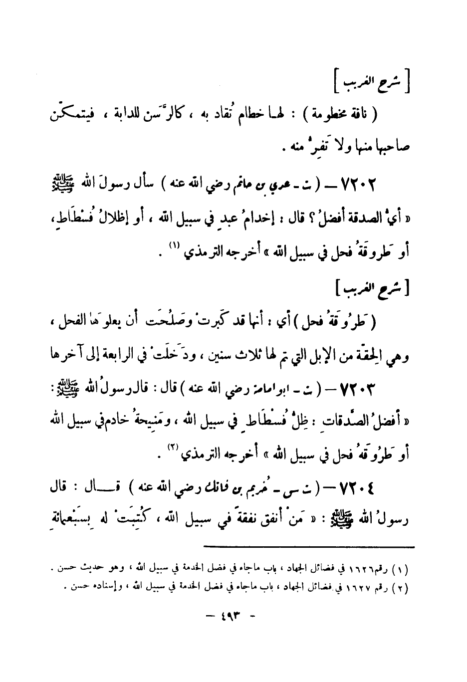 7202 - (ت) عدي بن حاتم - رضي الله عنه -: سأل رسولَ الله - صلى الله عليه وسلم- «أيُّ الصدقة أفضلُ؟ قال: إخدامُ عبد في سبيل الله، أو إظلالُ فُسْطَاط، أو طَروقَةُ فحل في سبيل الله» أخرجه الترمذي (¬1) .