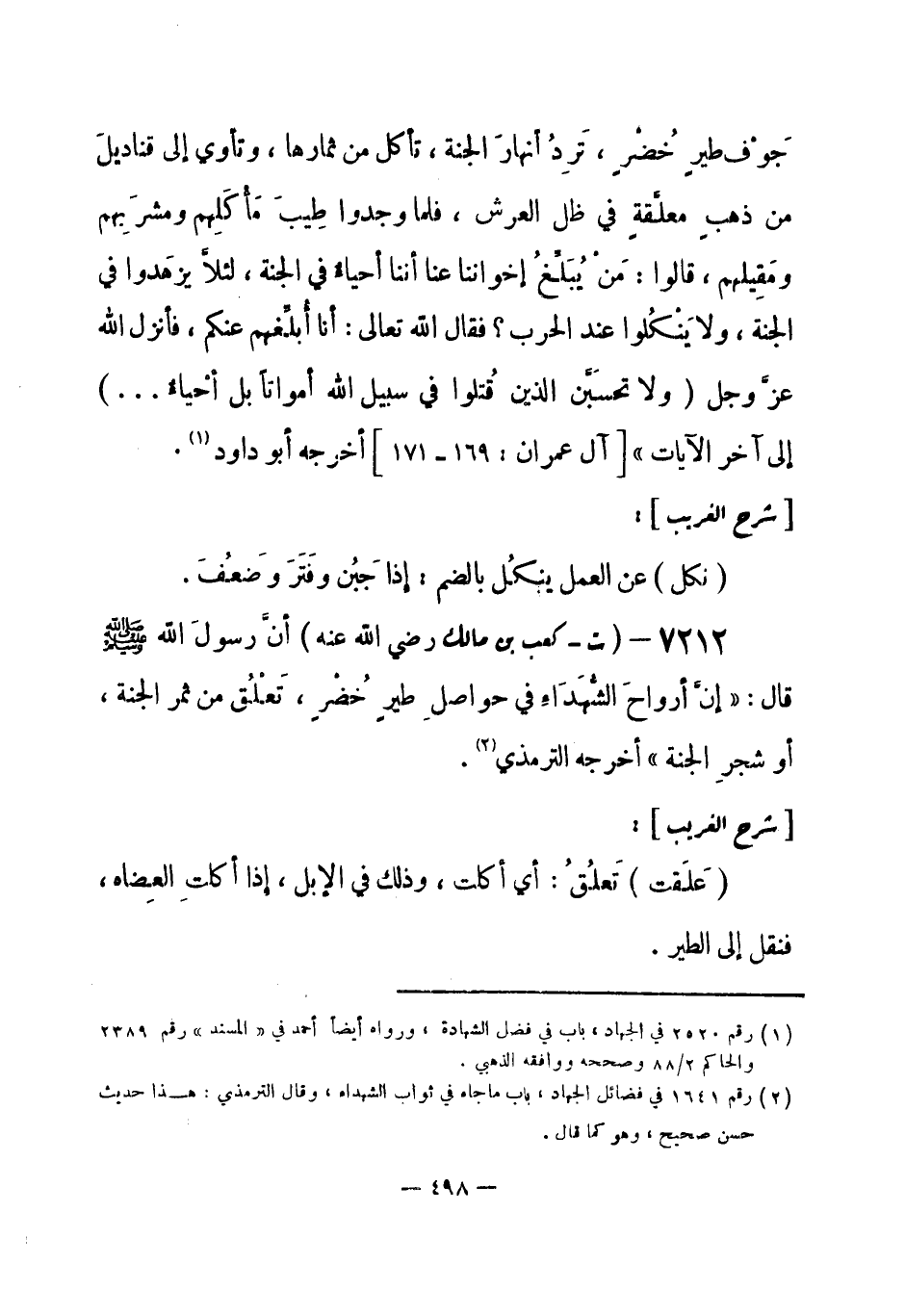 7212 - (ت) كعب بن مالك - رضي الله عنه - أن رسولَ الله - صلى الله عليه وسلم- قال: «إنَّ أرْواحَ الشُّهَدَاءِ في حواصلِ طير خُضْر، تَعْلُق من ثمر الجنة، أو شجرِ الجنة» أخرجه الترمذي (¬1) .