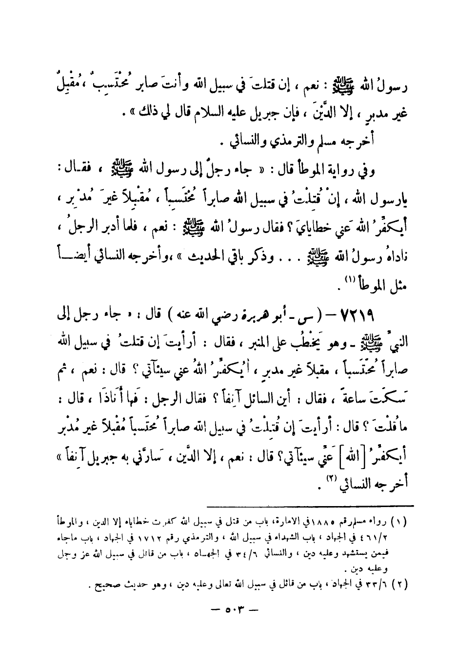 7219 - (س) أبو هريرة - رضي الله عنه - قال: «جاء رجل إلى النبيِّ - صلى الله عليه وسلم- وهو يَخْطُب على المنبر، فقال: أرأيتَ إن قُتلتُ في سبيل الله صابراً مُحْتَسباً. مقبلاً غير مدبر، أيُكفِّرُ الله عني سيئآتي؟ قال: نعم، ثم سَكَتَ ساعة، فقال: أين السائل آنِفاً؟ فقال الرجل: فها أنَا ذَا، قال: ما قُلْتَ؟ قال: أرأيتَ إن قُتِلْتُ في سبيل الله صابراً مُحتَسباً مُقْبلاً غير مُدْبر أيكفِّرُ [الله] عَنِّي سيئآتي؟ قال: نعم، إلا الدَّين، سَارَّني به جبريل آنفاً» أخرجه النسائي (¬1) .