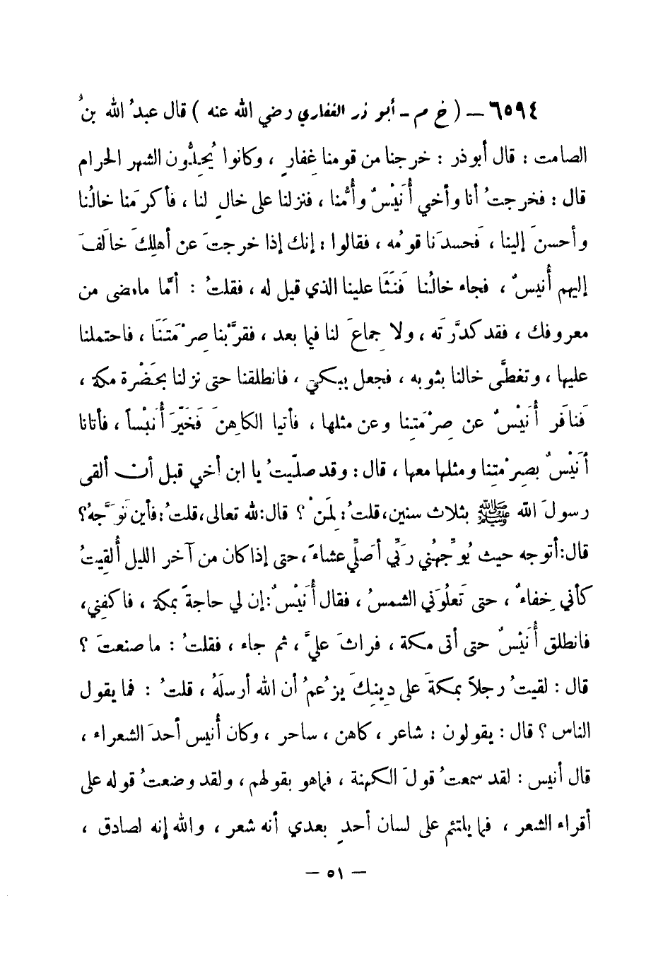 6594 - (خ م) أبو ذر الغفاري - رضي الله عنه - قال عبدُ الله بن الصامت: قال أبو ذر: خرجنا من قومنا غِفار، وكانوا يُحِلُّون الشهر الحرام قال: فخرجتُ أنا وأخي أُنَيْس وأمُّنا، فنزلنا على خالٍ لنا، فأكرمنا خالُنا وأحسنَ إلينا، فَحسدَنا قومُه، فقالوا: إنك إذا خرجتَ عن أهلِكَ خالَفَ إليهم أنيس، فجاء خالُنا فَنَثَا علينا الذي قيل له، فقلتُ: أمَّا ما مضى من معروفك، فقد كدَّرتَه، ولا جِمَاعَ لنا فيما بعد، فقرَّبْنا صِرْمَتَنَا، فاحتملنا عليها، وتغطَّى خالنا بثوبه، فجعل يبكي، فانطلقنا حتى نزلنا بحَضْرة مكة، فَنافَر أُنيس عن صِرْمَتِنا وعن مثلها، فأتيا الكاهِنَ فَخَيّرَ أُنَيْساً، فأتانا أنيس بصِرْمتِنا ومثلها معها، قال: وقد صلّيتُ يا ابن أخي قبل أن ألقى رسولَ الله - صلى الله عليه وسلم- بثلاث سنين، قلتُ: لِمَنْ؟ قال: لله تعالى، قلتُ: فأين تَوَجَّهُ؟ قال: أتوجه حيث يُوجِّهُني رَبِّي أصَلِّي عشاء، حتى إذا كان من آخر الليل أُلقِيتُ كأني خِفاء، حتى تَعلُوَني الشمسُ، فقال أُنَيْس: إن لي حاجة بمكة، فاكفِني، فانطلق أُنَيْس، حتى أتى مكة، فراثَ عليَّ، ثم جاءَ، فقلتُ: ما صنعتَ؟ قال: لقيتُ رجلاً بمكةَ على دينِكَ يزعُمُ أن الله أرسلَه، قلتُ: فما يقول الناس؟ قال: يقولون: شاعر، كاهن، ساحر، وكان أُنيس، أحدَ الشعراء، قال أنيس: لقد سمعتُ قولَ الكهنة، فما هو بقولهم، ولقد وضعتُ قوله على أقراء الشعر، فما يلتئم على لسان أحد بعدي أنه شعر، والله إنه لصادق، -[52]- وإنهم لكاذبون، قال: قلتُ: فاكْفِني حتى أذهبَ فأنظُرَ، قال: فأتيتُ مكةَ فتضعَّفْتُ رجلاً منهم (¬1) ، فقلت: أين هذا الذي تدعونه الصّابئَ؟ فأشار إليَّ، فقال: الصَّابئ؟ فمال عَلَيَّ أهلُ الوادي بكل مَدَرة وعَظْم، حتى خررتُ مغشياً عليَّ، قال: فارتفعتُ [حين ارتفعتُ] كأني نُصُب أحمرُ، قال: فأتيت زَمْزَمَ، فَغَسَلْتُ عنِّي الدماءَ، وشَرِبْتُ من مائها، ولقد لبثتُ يا ابن أخي ثلاثين، بين ليلة ويوم، وما كان لي طعام إلا ماء زمزم، فسمنتُ حتى تكسَّرتْ عُكَنُ بطني، وما وجَدْتُ على كبدي سُخْفةَ جوع، قال: فبينما أهل مكة في ليلة قَمراءَ إضْحيانَ، إذ ضُرب على أصمختهم، فما يطوف بالبيت أحد، إلا امرأتان منهم تَدْعُوَان إسافا ونائلة، قال: فأتتا عَليَّ في طوافهما، فقلت: أنكحا أحدهما الأخرى، قال: فما تَناهتا عن قولهما، قال: فأتتا عليَّ، فقلتُ: هَن مثل الخشبة - غير أني لا أكْنِي - فانْطَلقتا تُوَلْوِلاَن، وتقولان: لو كان هاهنا أحد من أنفارنا؟ قال: فاسْتَقبَلهما رسولُ الله - صلى الله عليه وسلم- وأبو بكر، وهما هابِطان، قال: ما لكما؟ قالتا: الصَّابيُ بين الكعبة وأستارها، قال: ما قال لكما؟ قالتا: إنه قال لنا كلمة تملأ الفم، وجاء رسولُ الله - صلى الله عليه وسلم- حتى اسْتَلم الحجَر، وطاف بالبيت هو وصاحبُه، ثم صلى، فلما قضى صلاته، قال أبو ذرّ، فكنتُ أوَّلَ من حَيَّاه بتحية الإسلام، [قال: فقلت: السلام عليك يا رسول الله] فقال: وعليك ورحمةُ الله، ثم قال: ممن -[53]- أنت؟ قلت: من غِفار، قال: فأهْوَى بيده، فوضع أصابعه على جبهته، فقلتُ في نفسي: كره أن انْتَمَيْتُ إلى غِفار، فذهبتُ آخُذُ بيده، فَقَدَعني صاحبُه، وكان أعلمَ به مني، ثم رفع رأسه، فقال: متى كنت هاهنا؟ قال: [قلت] : كنتُ هاهنا منذ ثلاثين، بين ليلة ويوم، قال: فمن كان يُطعمك؟ قال: قلتُ: ما كان لي طعام إلا ماءُ زمزم، فَسَمِنْتُ حتى تكسَّرتْ عُكَنُ بطني، وما أجد على كبدي سَخْفَةَ جوعِ، قال: إنها مباركة، إنها طعامُ طُعْم، فقال أبو بكر: يا رسولَ الله، ائْذَنْ لي في طعامه الليلةَ، فانطلق رسولُ الله - صلى الله عليه وسلم- وأبو بكر، وانطلقتُ معهما، ففتح أبو بكر باباً، فجعل يقبض لنا من زبيب الطائف، وكان ذلك أولَ طعام أكلته بها، ثم غَبَرْتُ ما غَبَرْتُ، ثم أتيتُ رسولَ الله - صلى الله عليه وسلم-، فقال: إنه قد وُجِّهَتْ لي أرض ذات نخل، لا أراها إلا يَثْربَ، فهل أنت مُبلّغ عني قومَك، عسى الله أن ينفعَهم بك، ويأجُرَك فيهم؟ فأتيتُ أُنَيْسَاً، فقال: ما ص