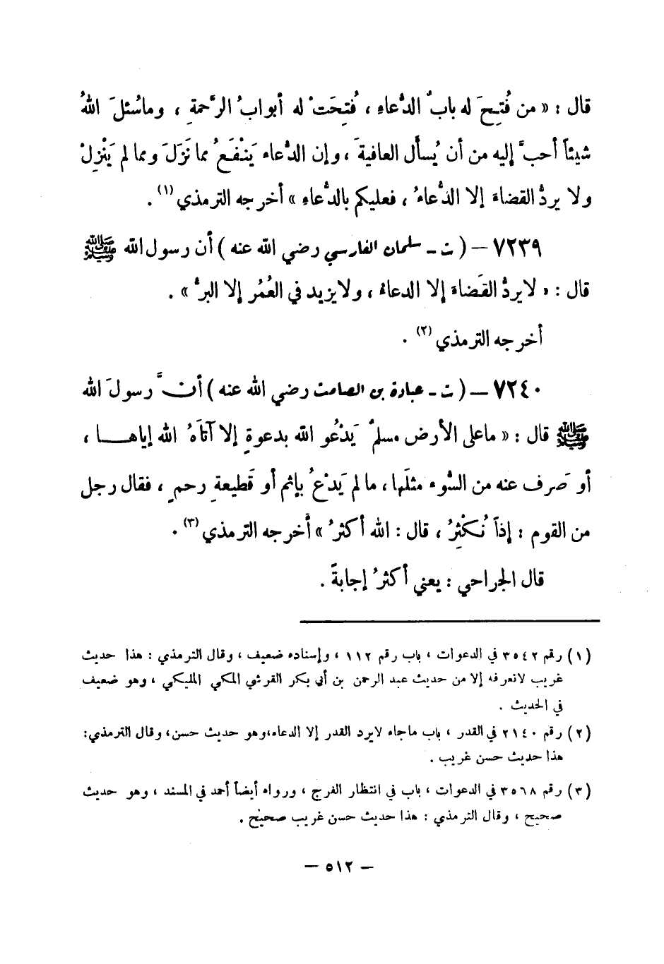 7239 - (ت) سلمان الفارسي - رضي الله عنه - أن رسولَ الله - صلى الله عليه وسلم- قال: «لا يردُّ القَضاءَ إلا الدُّعاءُ، ولا يزيد في العُمُر إلا البرُّ» .