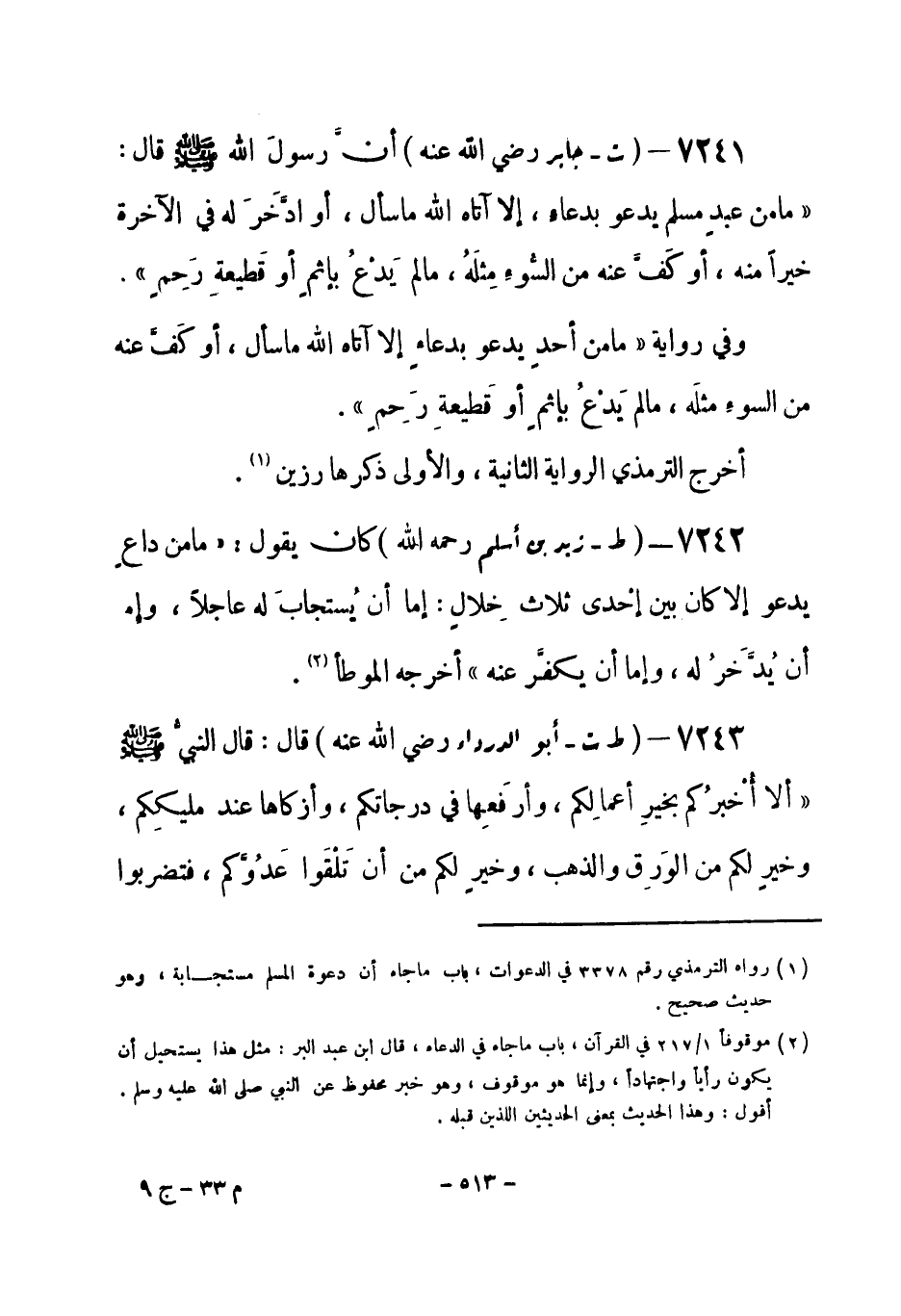 7241 - (ت) جابر - رضي الله عنه - أن رسولَ الله - صلى الله عليه وسلم- قال: «ما من عبد مسلم يدعو بدعاء، إلا آتاه الله ما سأل، أو ادَّخَرَ له في الآخرة خيراً منه، أو كَفَّ عنه من السُّوءِ مِثْلَه، ما لم يَدْعُ بإثم أو قَطيعةِ رَحِم» .