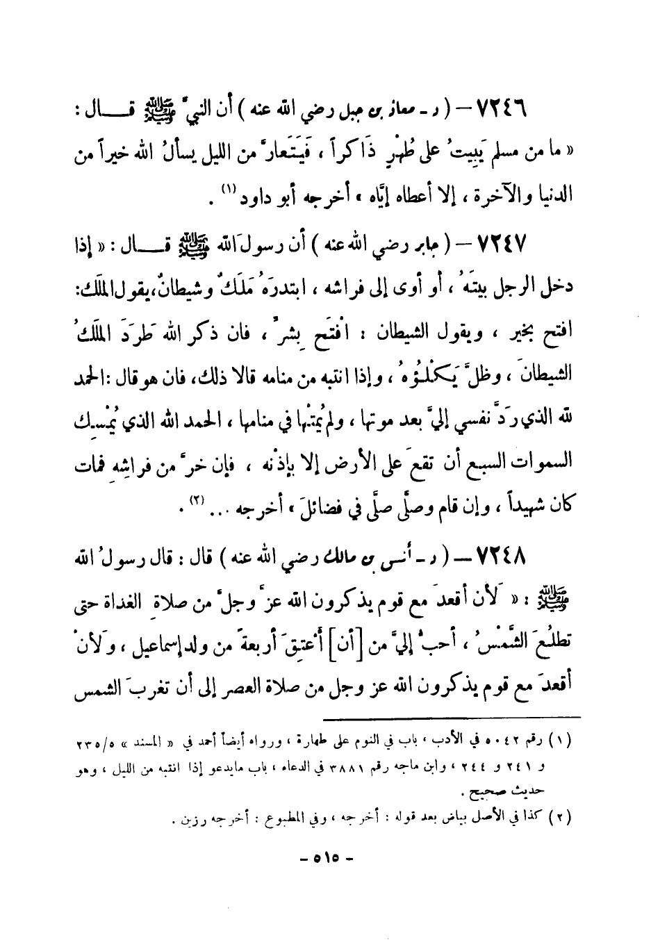 7246 - (د) معاذ بن جبل - رضي الله عنه - أنَّ النبي - صلى الله عليه وسلم- قال: «ما من مسلم يَبِيتُ على طُهْر ذَاكراً، فَيَتَعارَّ من الليل يسألُ الله خيراً من الدنيا والآخرة، إلا أعطاه الله إياه» أخرجه أبو داود (¬1) .