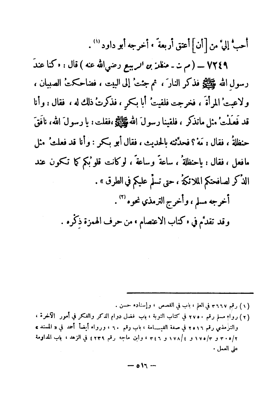 7249 - (م ت) حنظلة بن الربيع - رضي الله عنه - قال: «كنا عندَ رسولِ الله - صلى الله عليه وسلم- فذكر النار، ثم جئتُ إلى البيت، فضاحكتُ الصبيان ولاعبتُ المرأةَ، فخرجت فلقيتُ أبا بكر، فذكرتُ ذلك له، فقال: وأنا قد فَعَلْتُ مثل ما تذكر، فلقينا رسولَ الله - صلى الله عليه وسلم-، فقلت: يا رسولَ الله، نافَقَ حنظلةُ، فقال: مَه؟ فحدَّثْتُه بالحديث، فقال أبو بكر: وأنا قد فعلتُ مثل ما فعل، فقال: يا حنظلةُ، ساعة وساعة، لو كانت قلوبُكم كما تكون عند الذِّكر لصافحتكم الملائكةُ، حتى تُسلِّم عليكم في الطرق» .