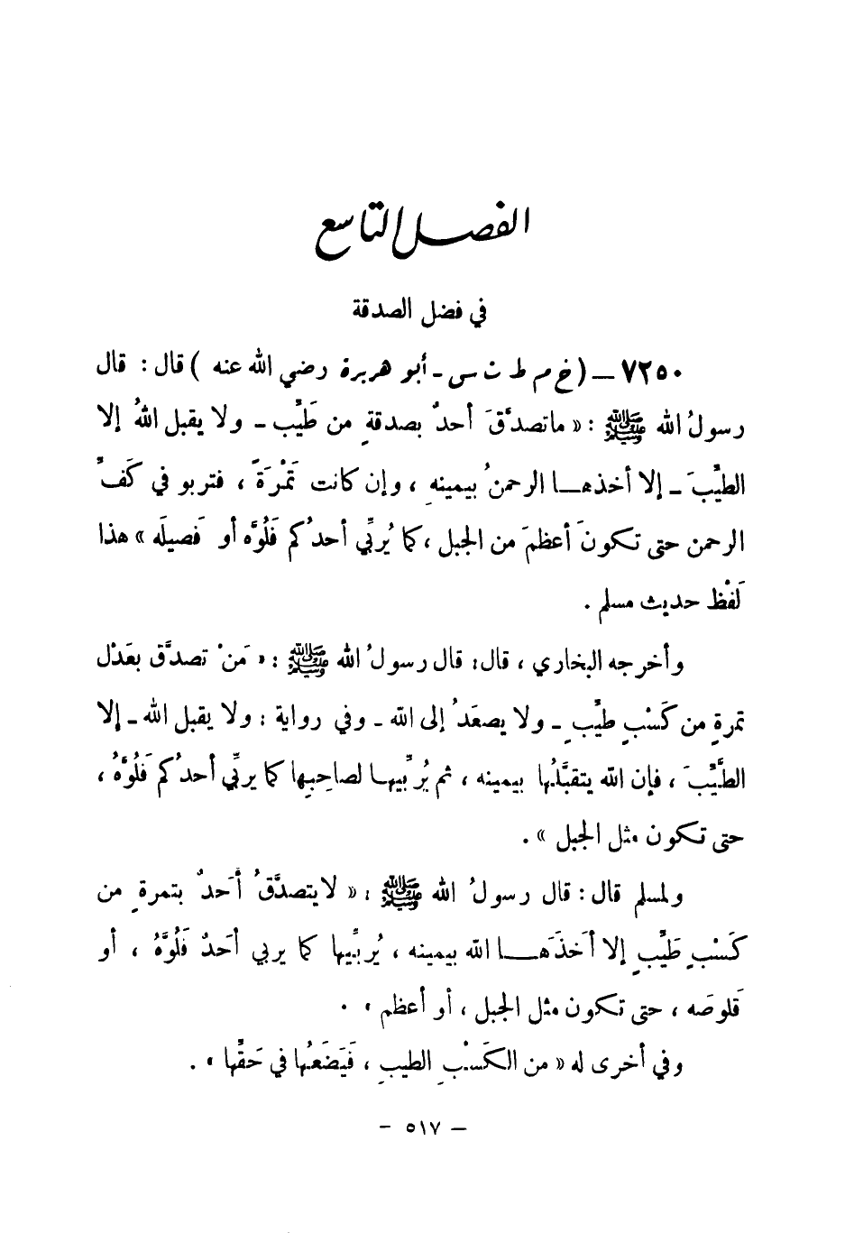 7250 - (خ م ط ت س) أبو هريرة - رضي الله عنه - قال: قال رسولُ الله - صلى الله عليه وسلم-: «ما تصدَّقَ أحد بصدقة من طَيِّب - ولا يقبل الله إلا الطَّيبَ - إلا أخذها الرحمن بيمينه، وإن كانت تَمْرَة، فتربو في كَفِّ الرحمن حتى تكونَ أعظمَ من الجبل، كما يُربِّي أحدُكم فَلُوَّه أو فَصيلَه» هذا لَفْظ حديث مسلم.