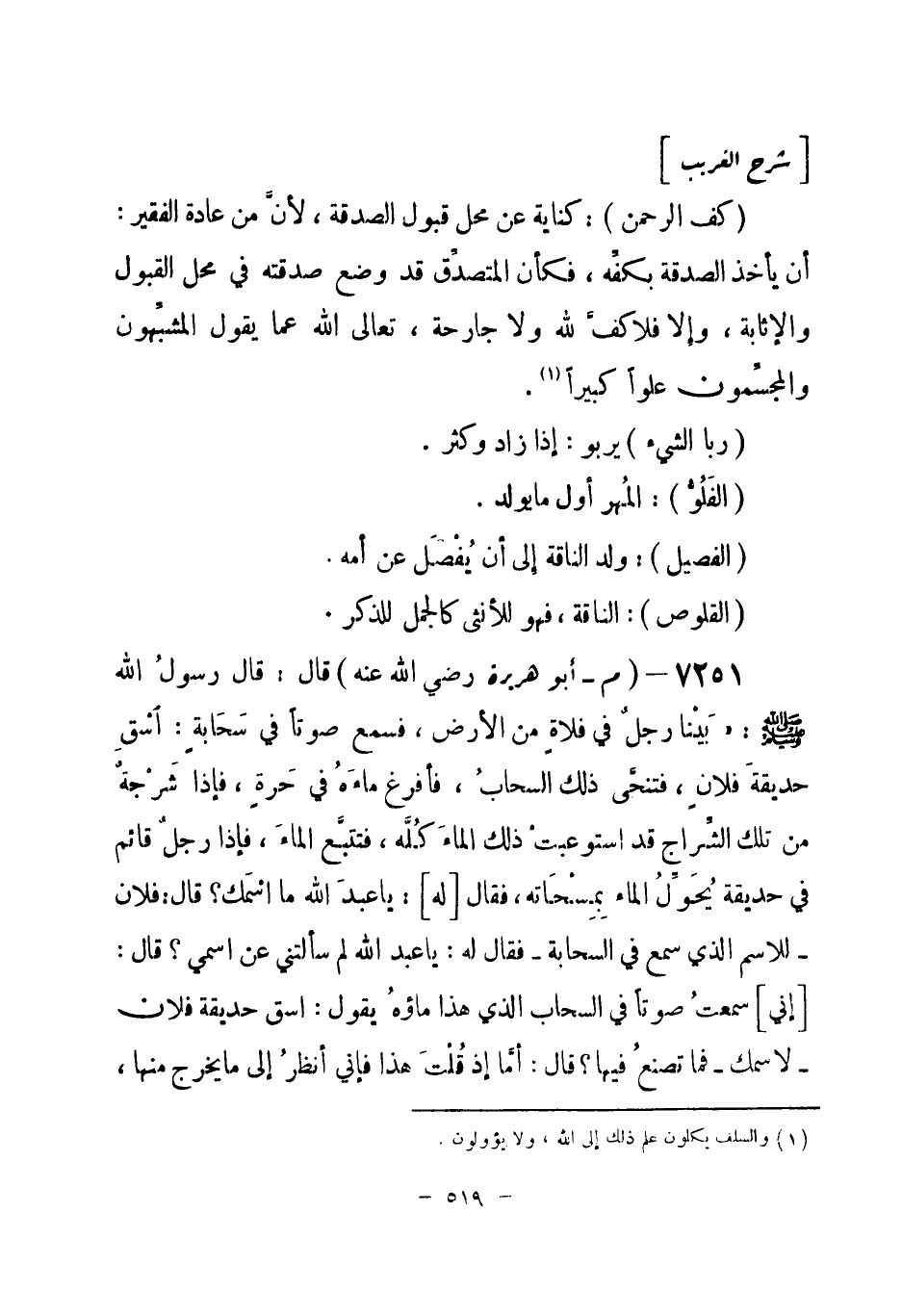 7251 - (م) أبو هريرة - رضي الله عنه - قال: قال رسولُ الله - صلى الله عليه وسلم-: «بَيْنا رجل في فلاة من الأرض، فسمع صوتاً في سَحَابة: اسْقِ حديقةَ فلان، فتنحَّى ذلك السحابُ، فأفرغَ ماءه في حَرة، فإذا شَرْجة من تلك الشِّراج قد استوعبتْ ذلك الماء كُلَّه، فتتبَّع الماءَ، فإذا رجل قائم في حديقة يُحَوِّلُ الماء بِمِسْحَاته، فقال [له] : يا عبدَ الله، ما اسْمُك؟ قال: فلان - للاسم الذي سمع في السحابة - فقال له: يا عبد الله لم سألتني عن اسمي؟ قال: [إني] سمعتُ صوتاً في السحاب الذي هذا ماؤهُ يقول: اسق حديقة فلان - لاسمك - فما تصنعُ فيها؟ قال: أمَّا إذ قُلْتَ هذا فإني أنظرُ إلى ما يخرج منها، -[520]- فأتصدق بثلثه، وآكلُ أنا وعيالي ثُلُثاً، وأرَدُّ فيها ثُلُثَهُ» وفي رواية «وأجعل ثُلُثَه في المساكين والسائلين وابن السبيل» أخرجه مسلم (¬1) .
