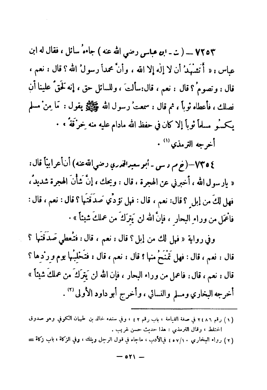 7254 - (خ م د س) أبو سعيد الخدري - رضي الله عنه - أن أعرابيّاً قال: «يا رسول الله، أخبرني عن الهجرة، قال: ويحك، إنَّ شَأنَ الهجرة شديد، فهل لكَ من إبل؟ قال: نعم، قال: فهل تؤدِّي صَدَقَتَها؟ قال: نعم، قال: فاعْمَل من وراءِ البحار، فإنَّ الله لن يَتِرَكَ من عملك شيئاً» .