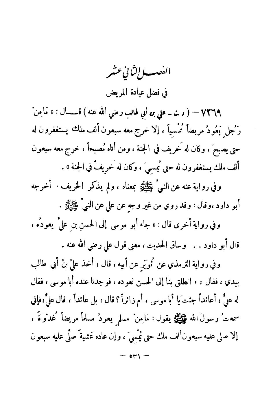 7269 - (د ت) علي بن أبي طالب - رضي الله عنه - قال: «مَا مِنْ رَجُل يَعُودُ مريضاً مُمْسياً، إلا خرج معه سبعون ألف ملك، يستغفرون له حتى يصبحَ، وكان له خَريف في الجنة، ومن أتاه مُصبحاً، خرج معه سبعون ألف ملك يستغفرون له حتى يُمْسِيَ، وكان له خَرِيف في الجنة» .