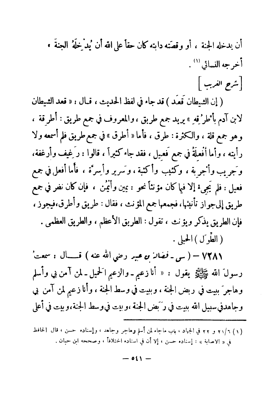 7281 - (س) فضالة بن عبيد - رضي الله عنه - قال: سمعتُ رسولَ الله - صلى الله عليه وسلم- يقول: «أنا زعيم - والزعيم الحَميل - لمن آمن بي وأسلم وهاجر ببيت في ربض الجنة، وببيت في وسط الجنة، وأنا زعيم لمن آمن بي وجاهد في سبيل الله ببيت في رَبَضِ الجنة، وبيت في وسط الجنة، وبيت في أعلى -[542]- غرف الجنة، من فعل ذلك، لم يَدَعْ للخير مطلباً، ولا من الشر مهرباً، يموت حيث شاء أن يموتَ» أخرجه النسائي (¬1) .
